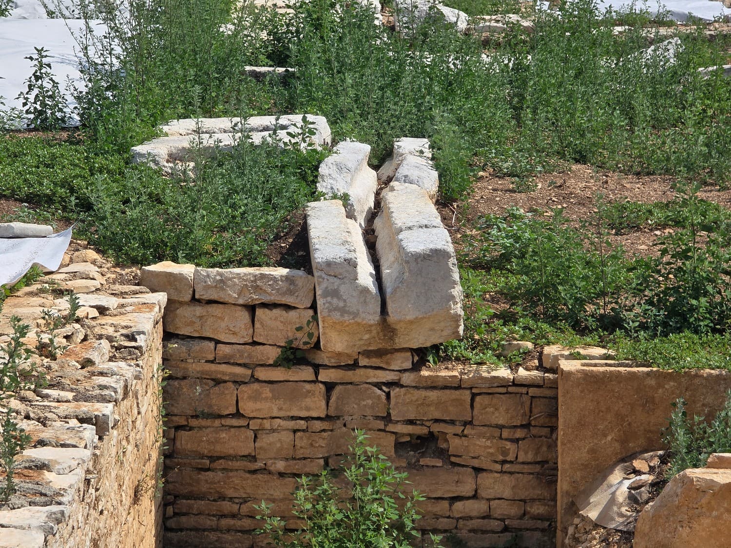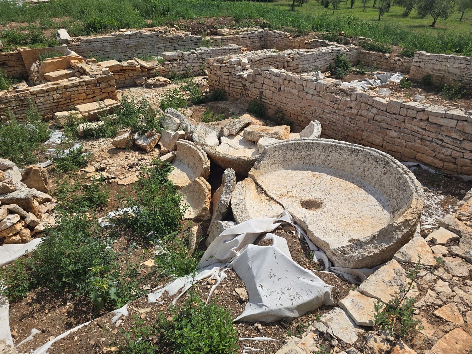 Among the debris a visitor can see stones with square holes where the wooden shed support has once been, the remains of olive presses, oil ducts and shattered basins.