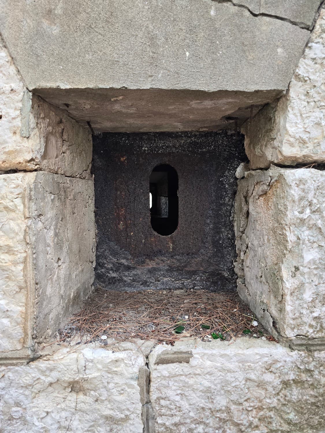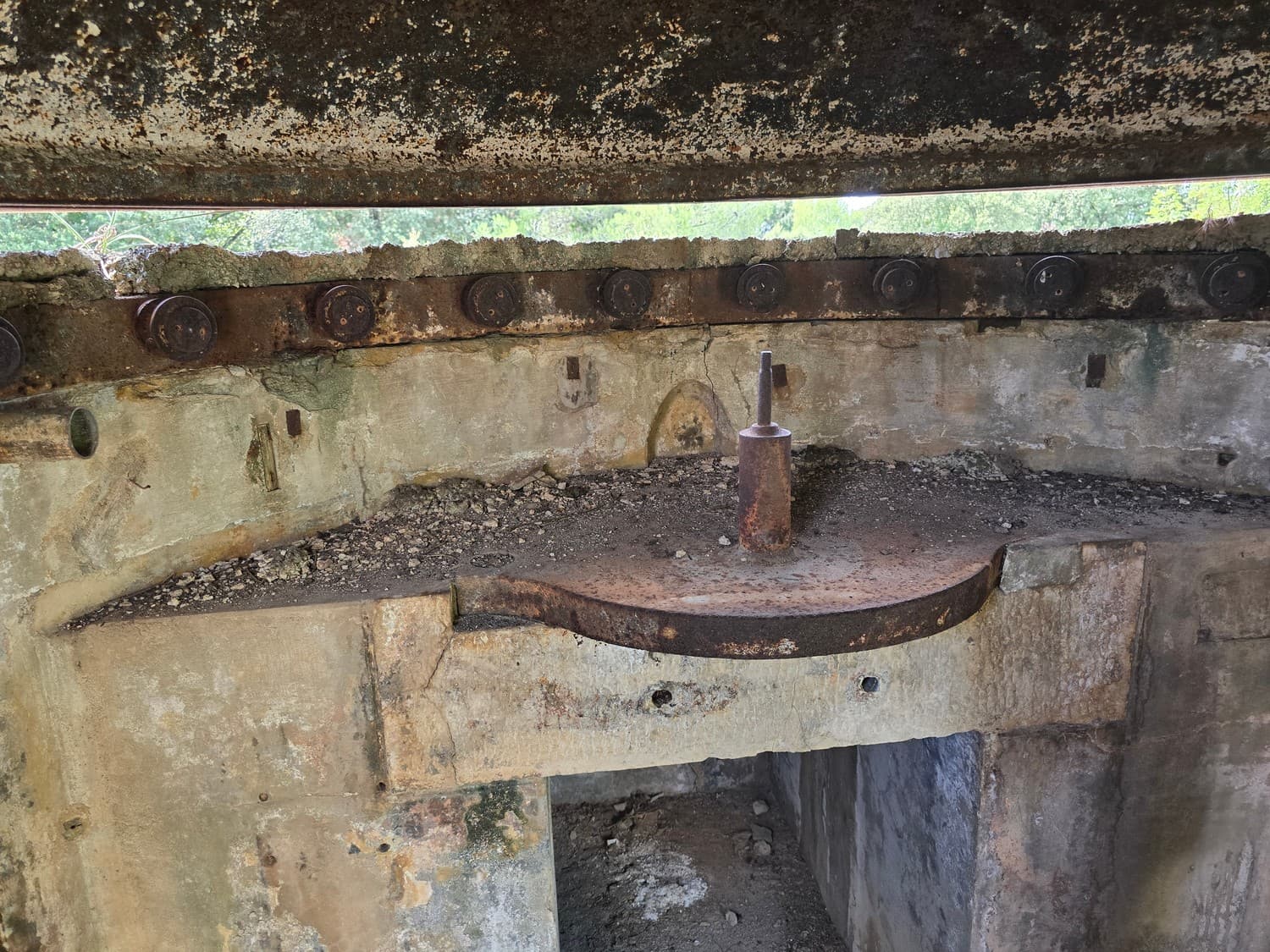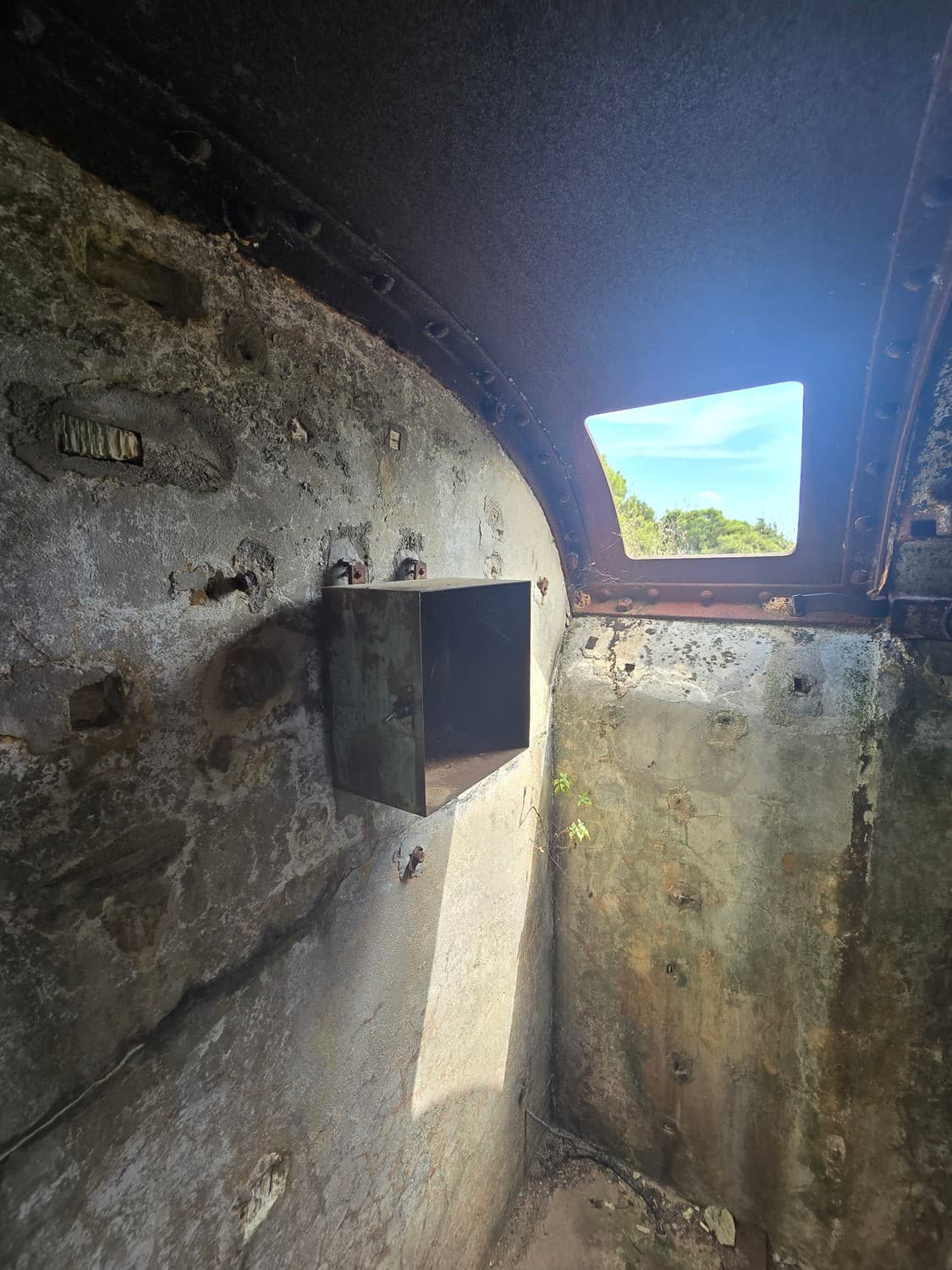 A range finder is a device that measures the distance to a target, so the artillery could hit it. The embrasure of one of the cupolas was again half-fileld with concrete, making it even narrower than it used to be.