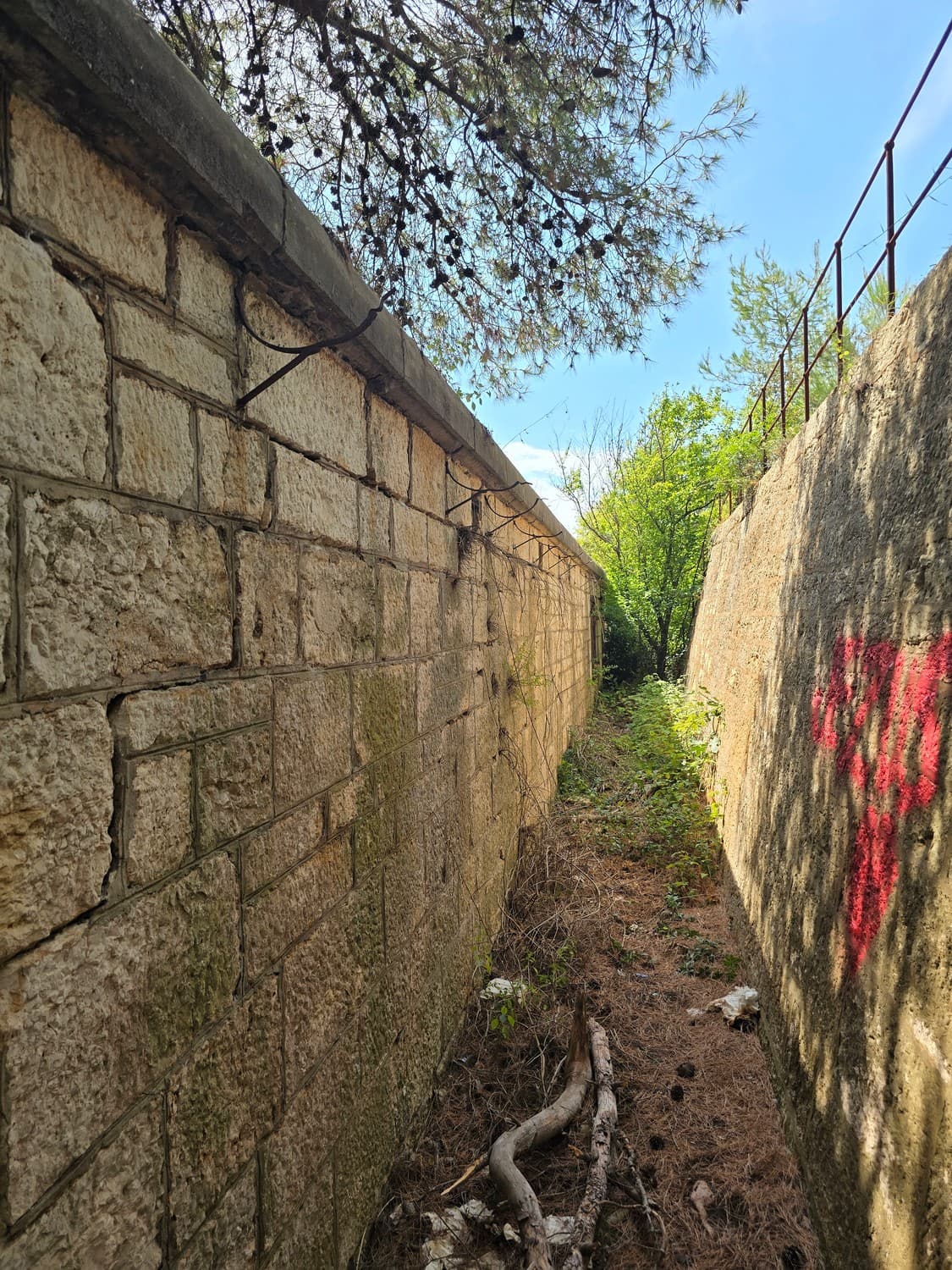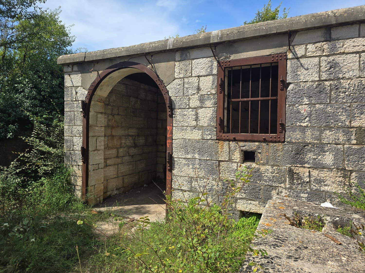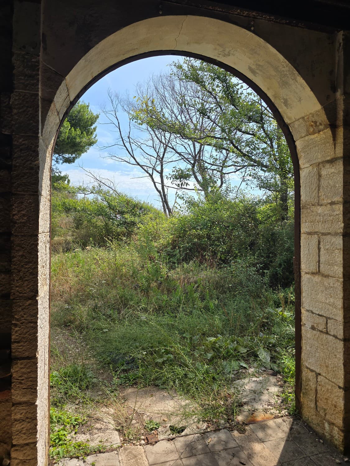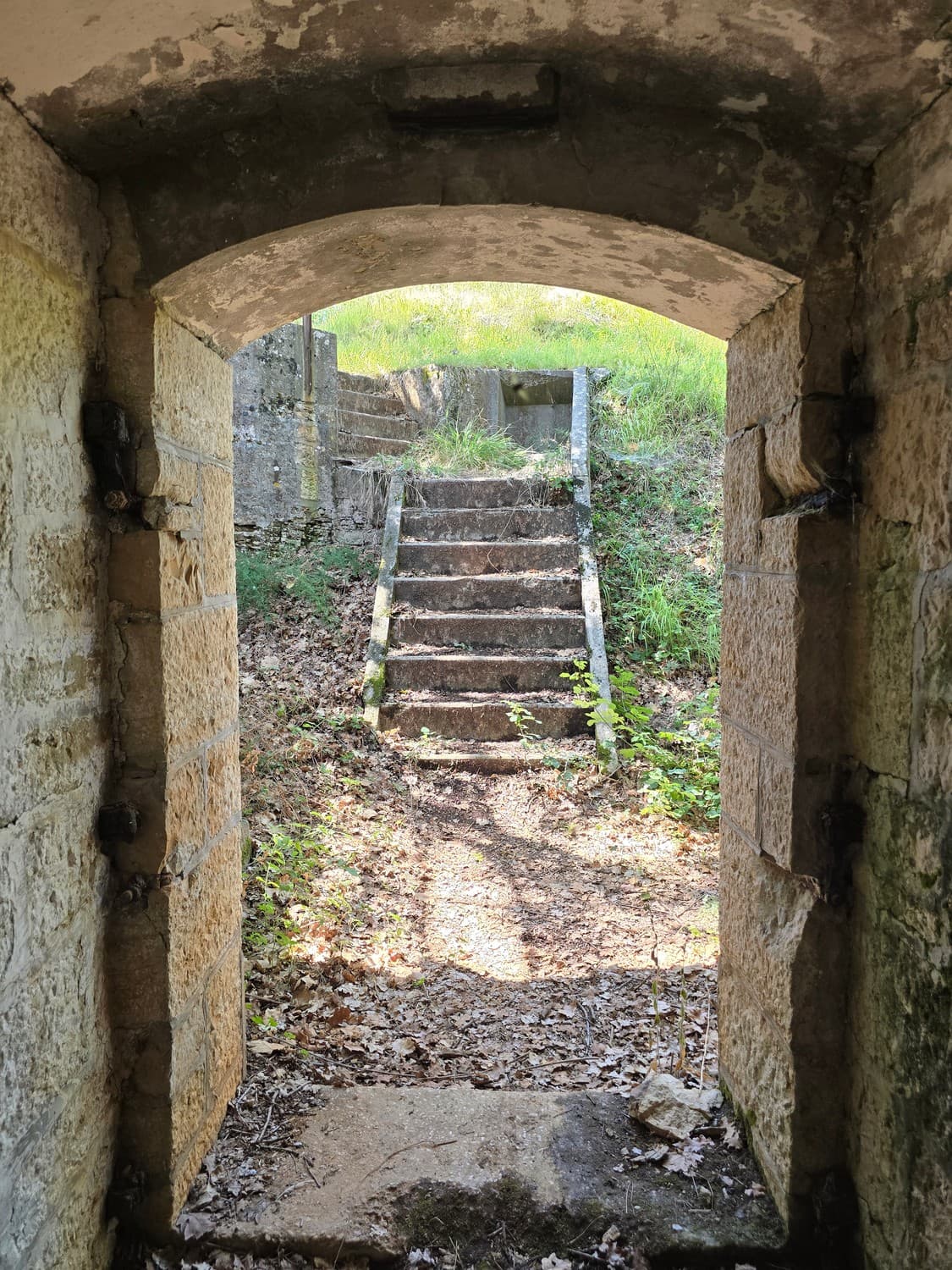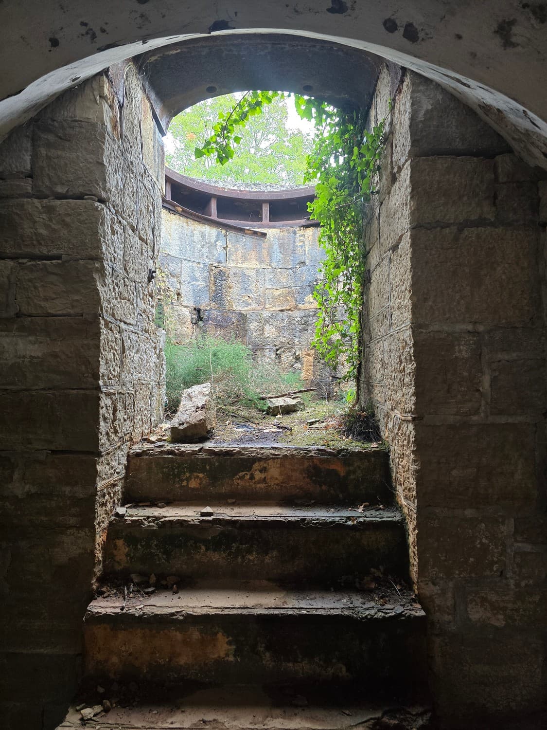 On our way out I've taken a few shots of the gorgeous gorge caponier we couldn't get into. The moat cut from the solid rock was entirely covered with vegetation. A small stone ladder at the beginning of the way to the caponier had something that looked like a tombstone as one of the steps. The text was partially visible, but I couldn't make out what it said.