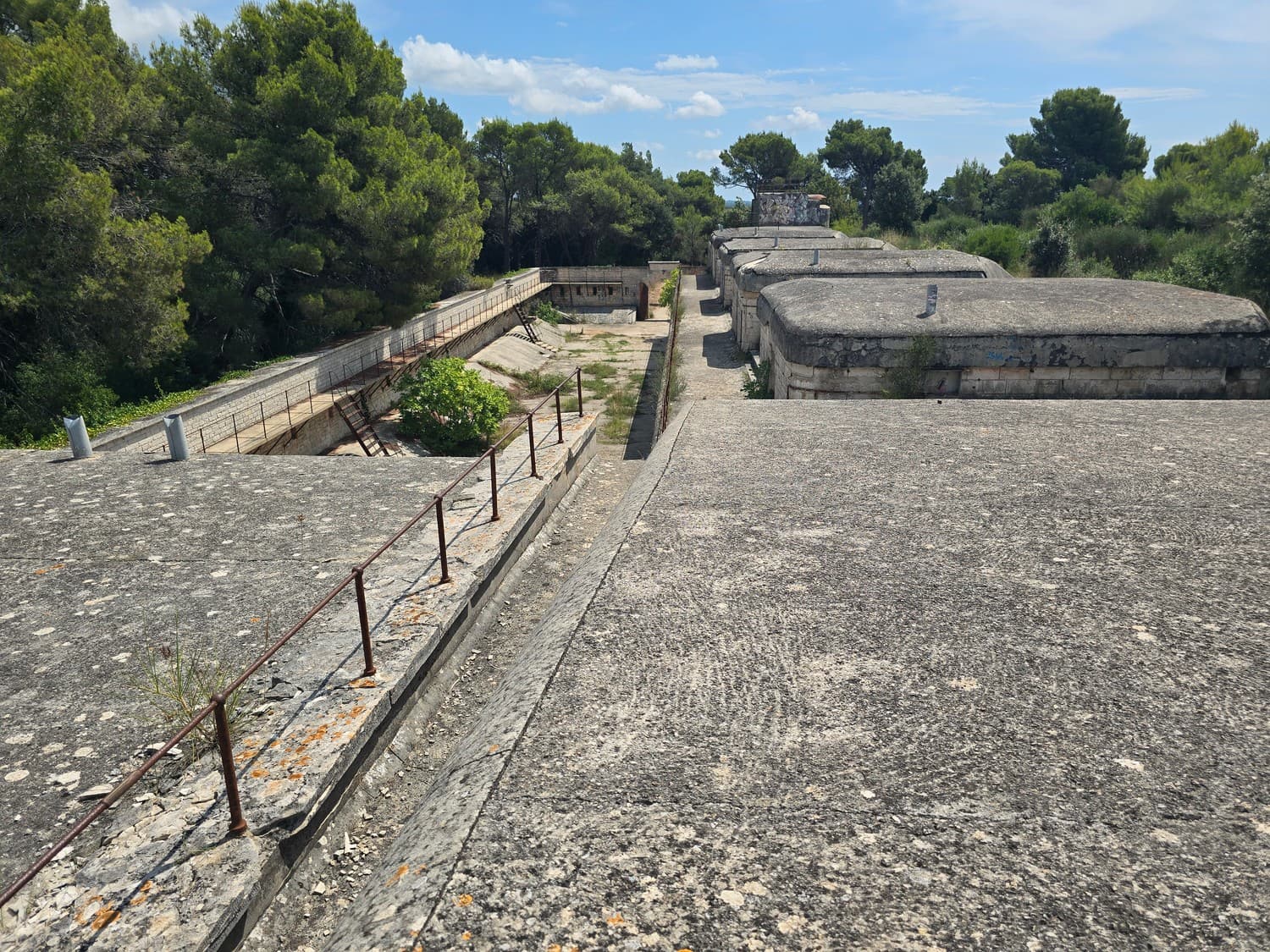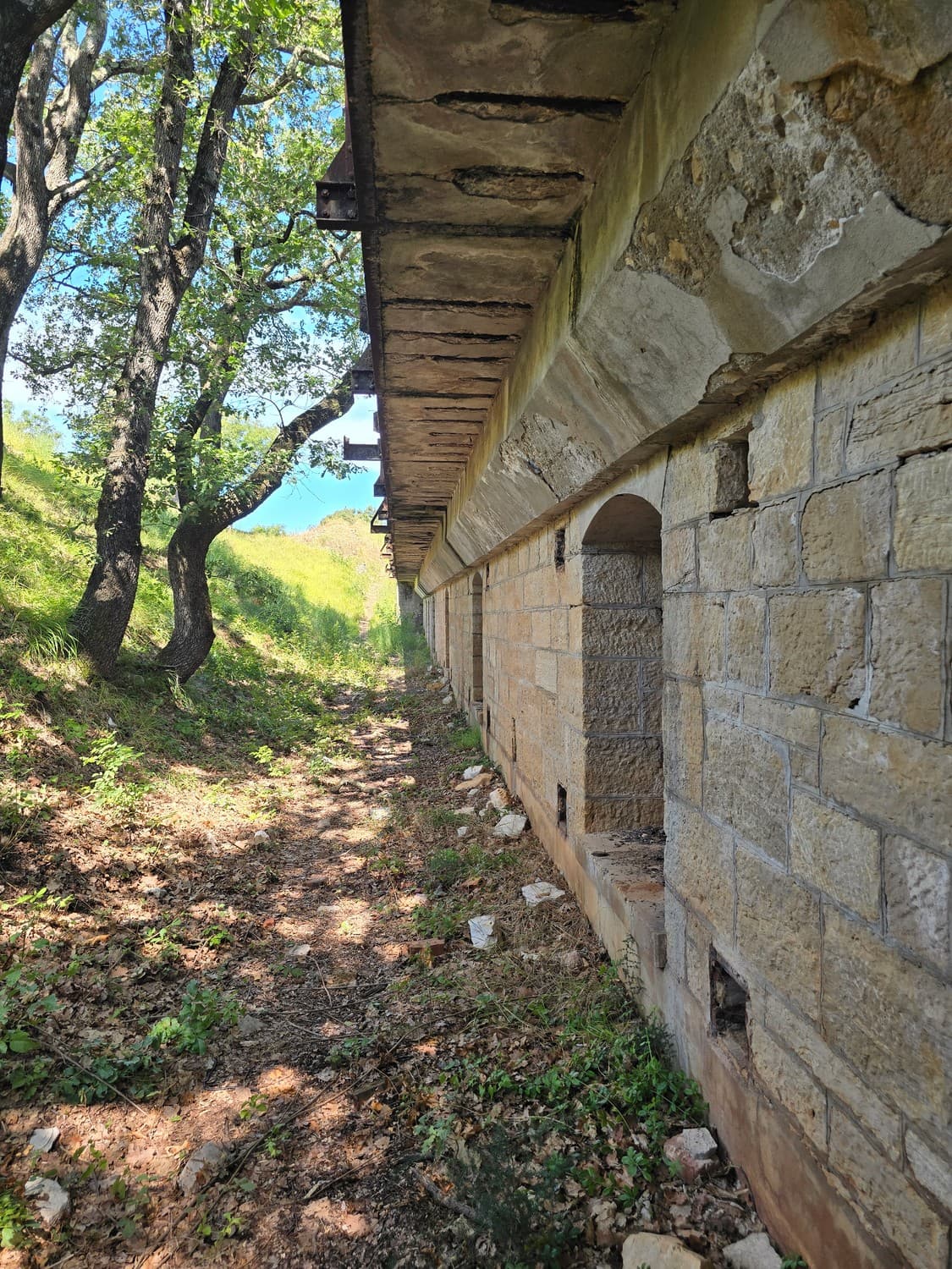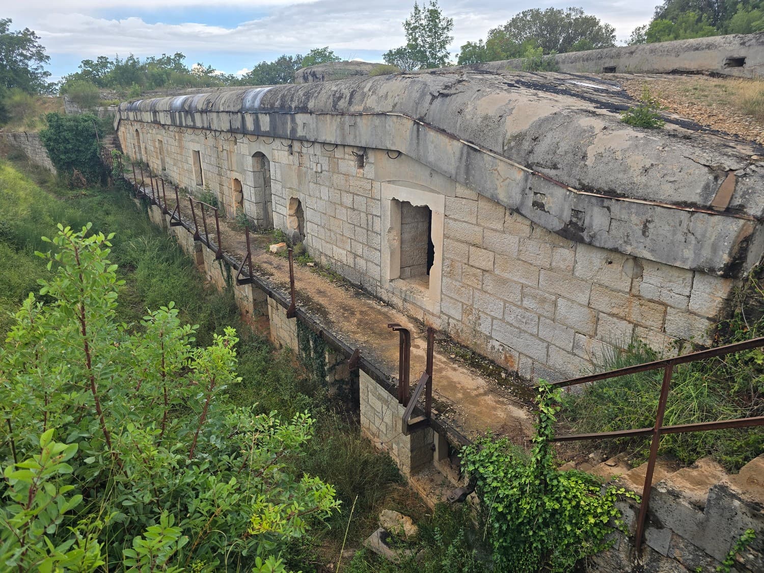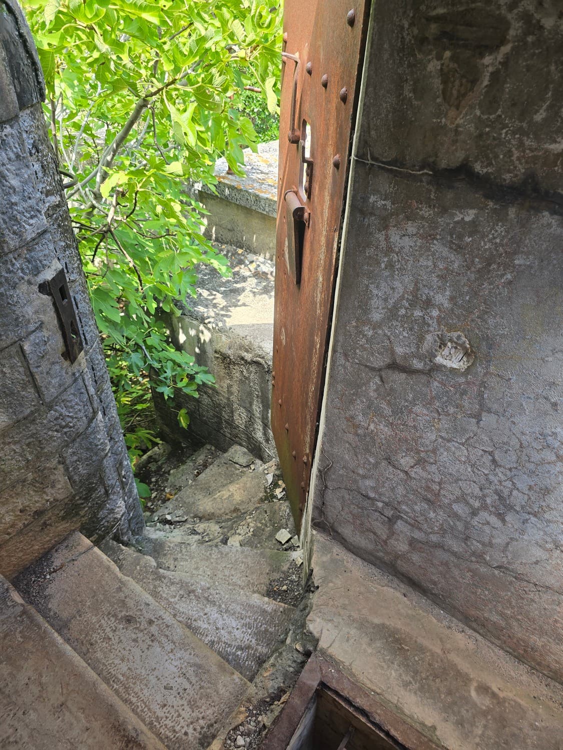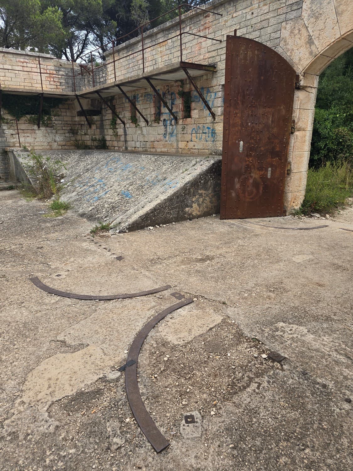 So, somewhere at the beginning of the 20th century the fortifications across Europe were upgraded with concrete roofs. I guess, in case of fort Benedetto, its fire platforms fell victim to the upgrade. The southern gun platform had a gun hangar next to it, and upon giving the upgrade they didn't even bother removing the rails: the rails just went straight under the concrete slab. It's not like people hoped to remove the protective cover one day, bring the guns back and resume like nothing had happened, is it?