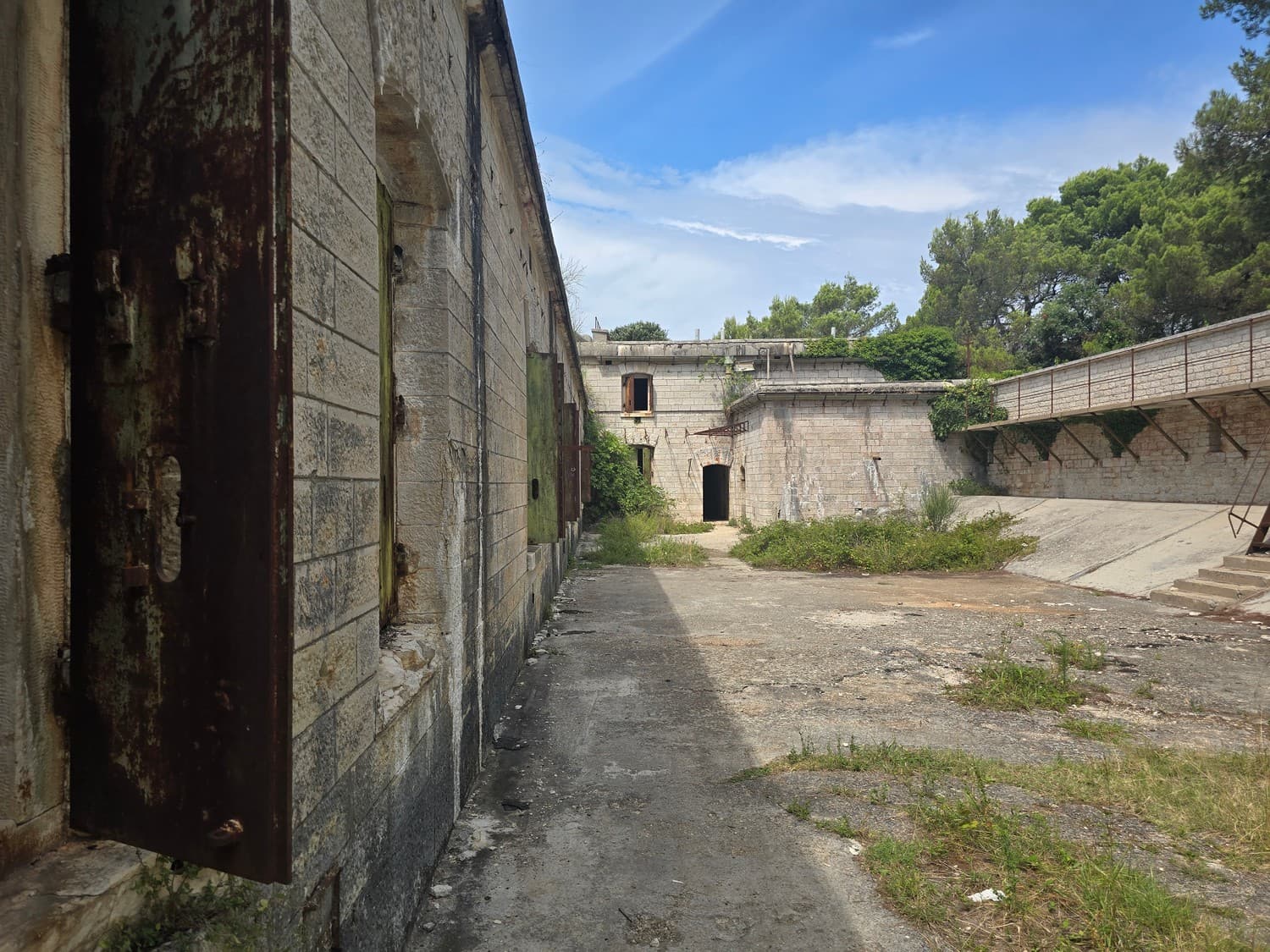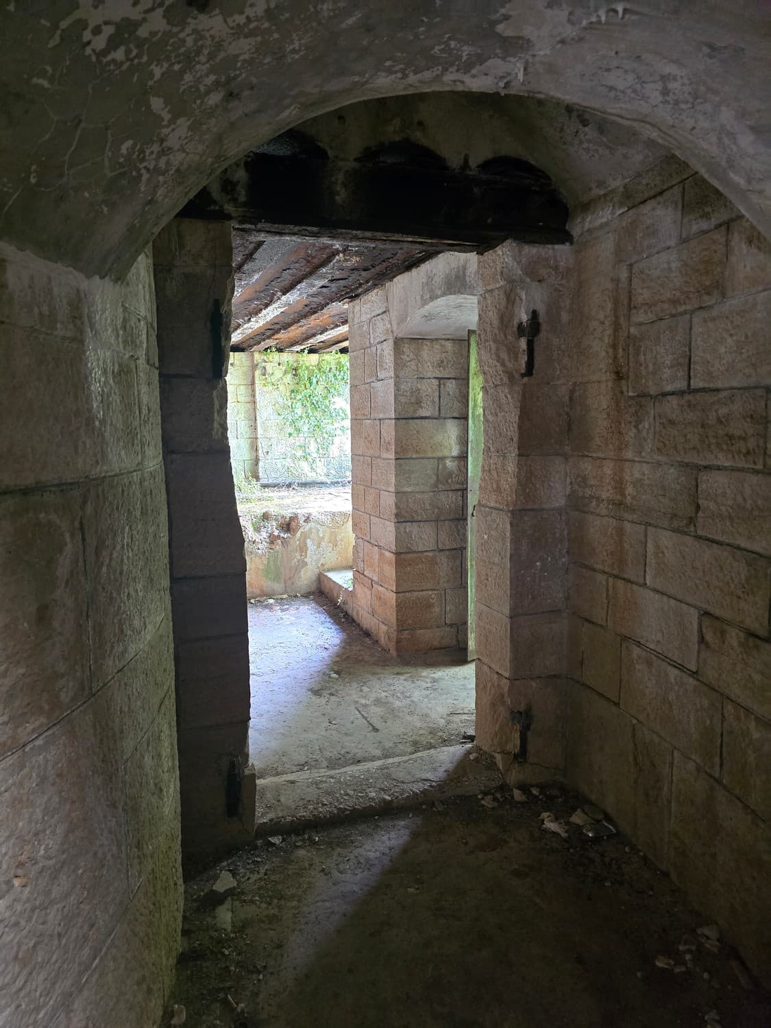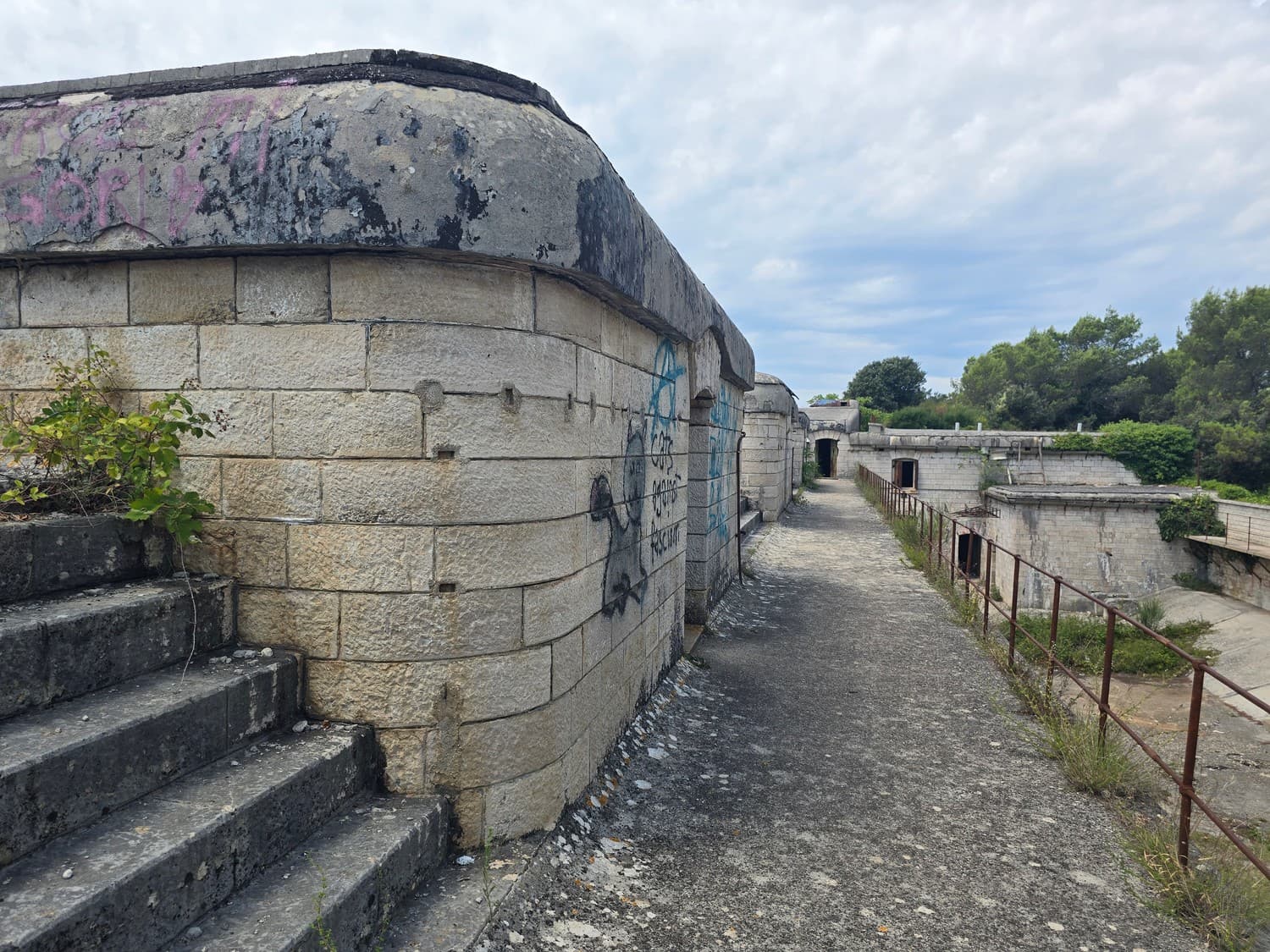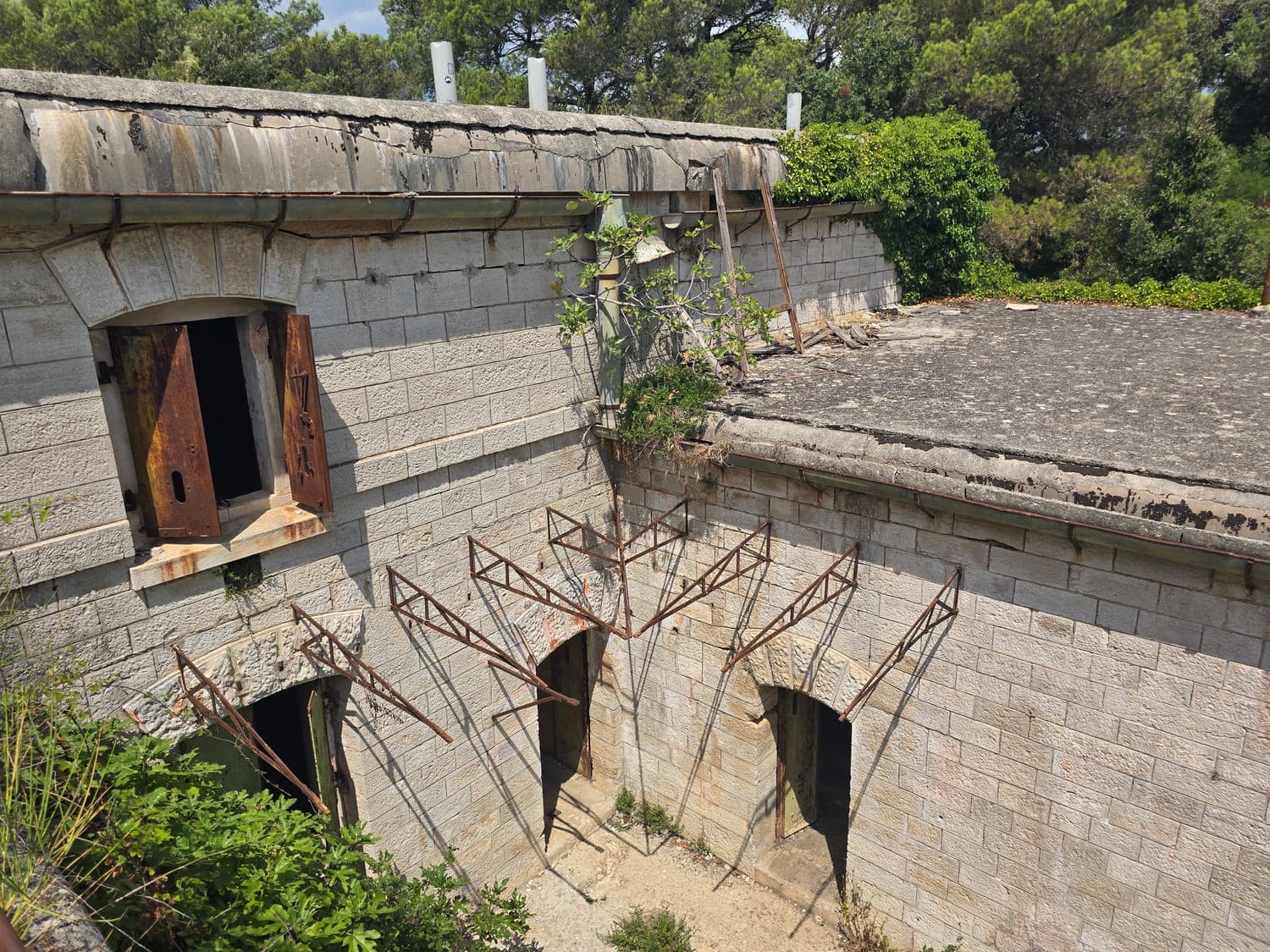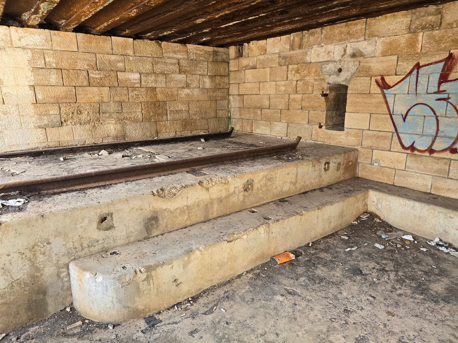 So, somewhere at the beginning of the 20th century the fortifications across Europe were upgraded with concrete roofs. I guess, in case of fort Benedetto, its fire platforms fell victim to the upgrade. The southern gun platform had a gun hangar next to it, and upon giving the upgrade they didn't even bother removing the rails: the rails just went straight under the concrete slab. It's not like people hoped to remove the protective cover one day, bring the guns back and resume like nothing had happened, is it?