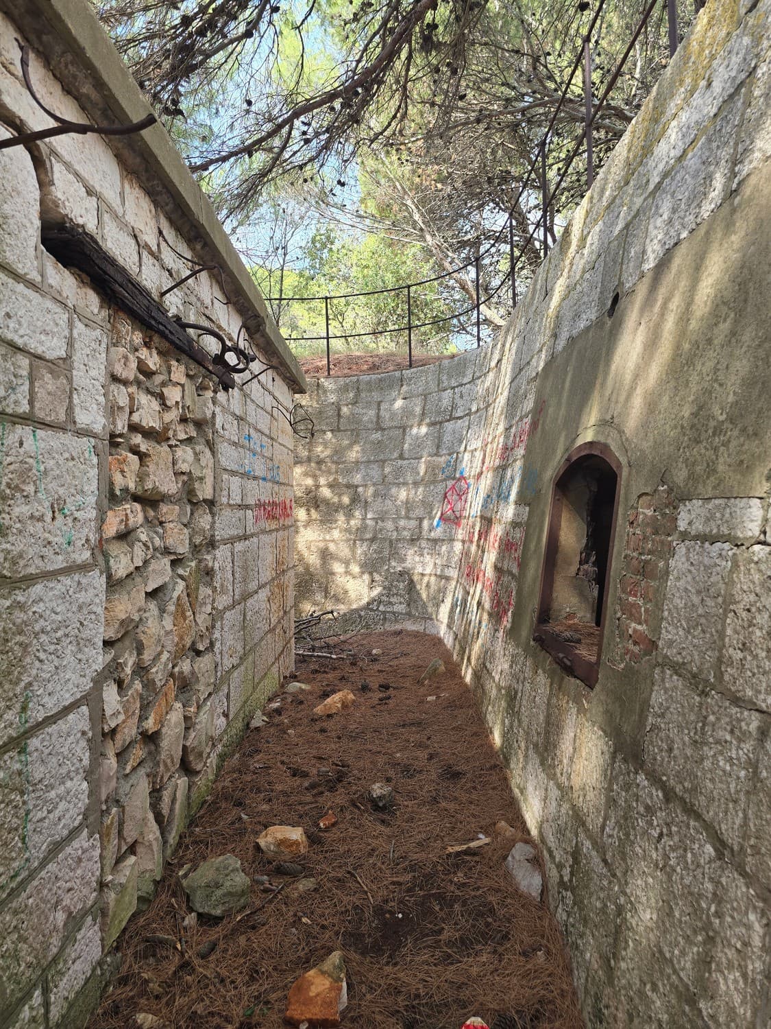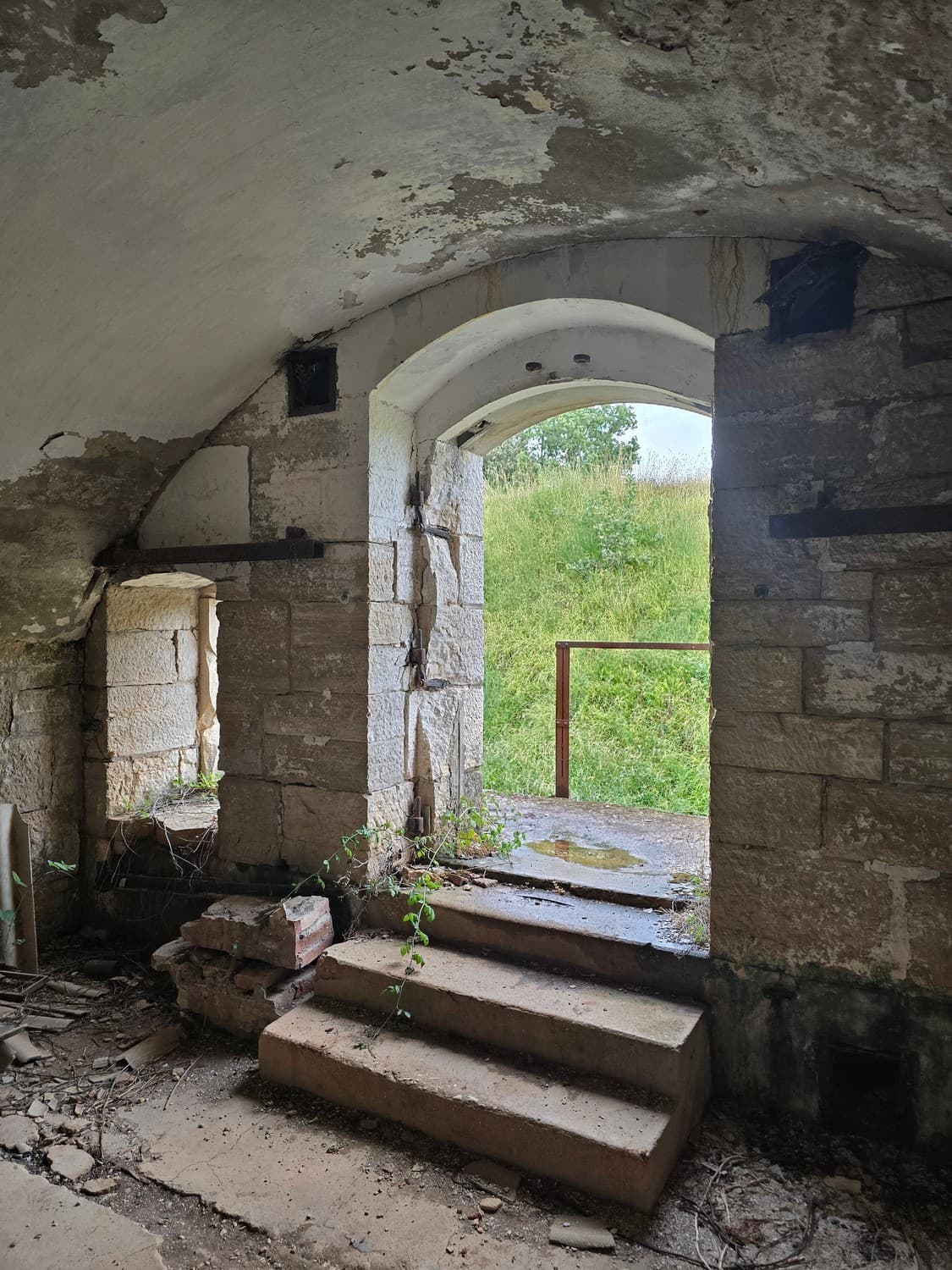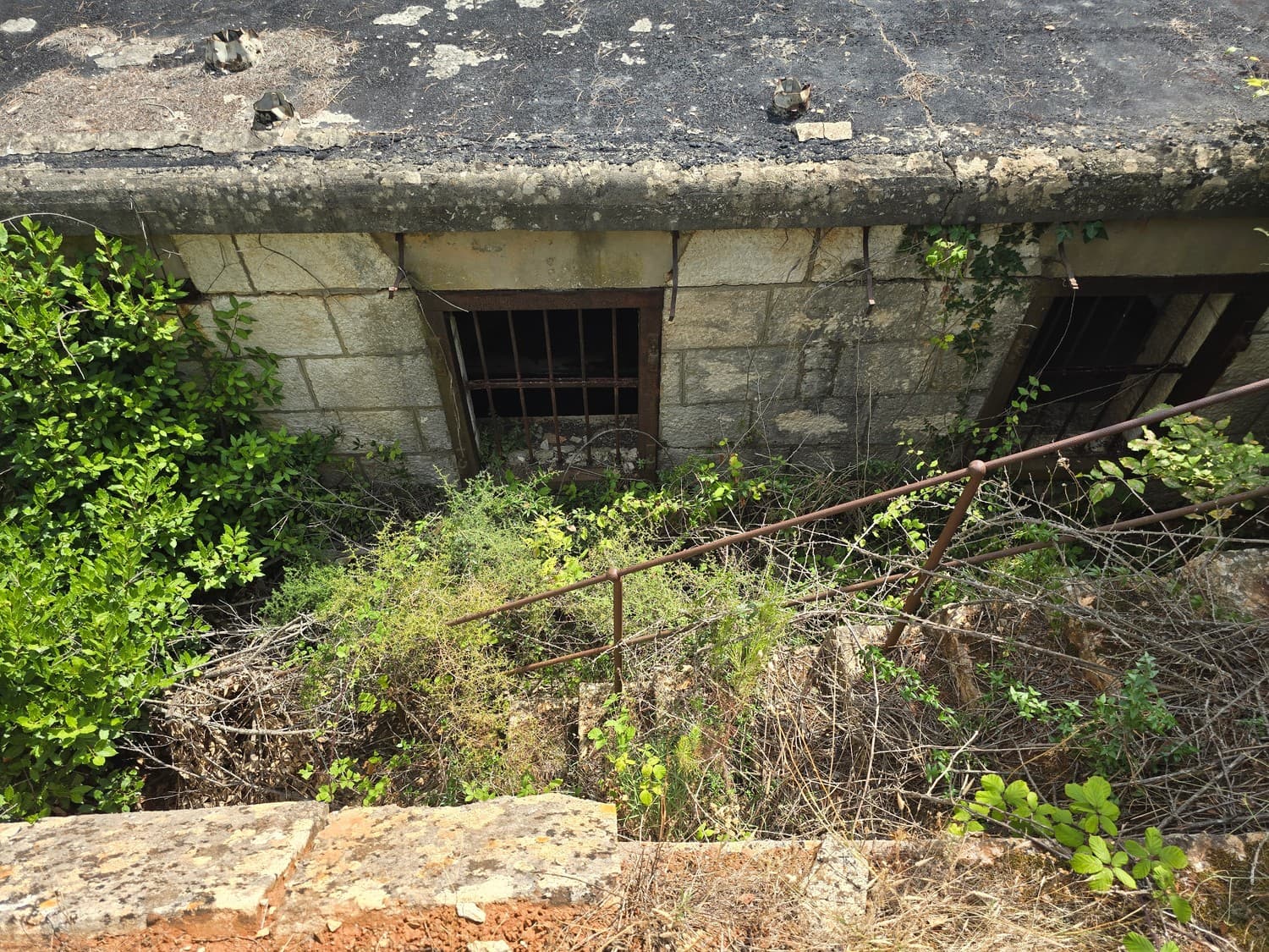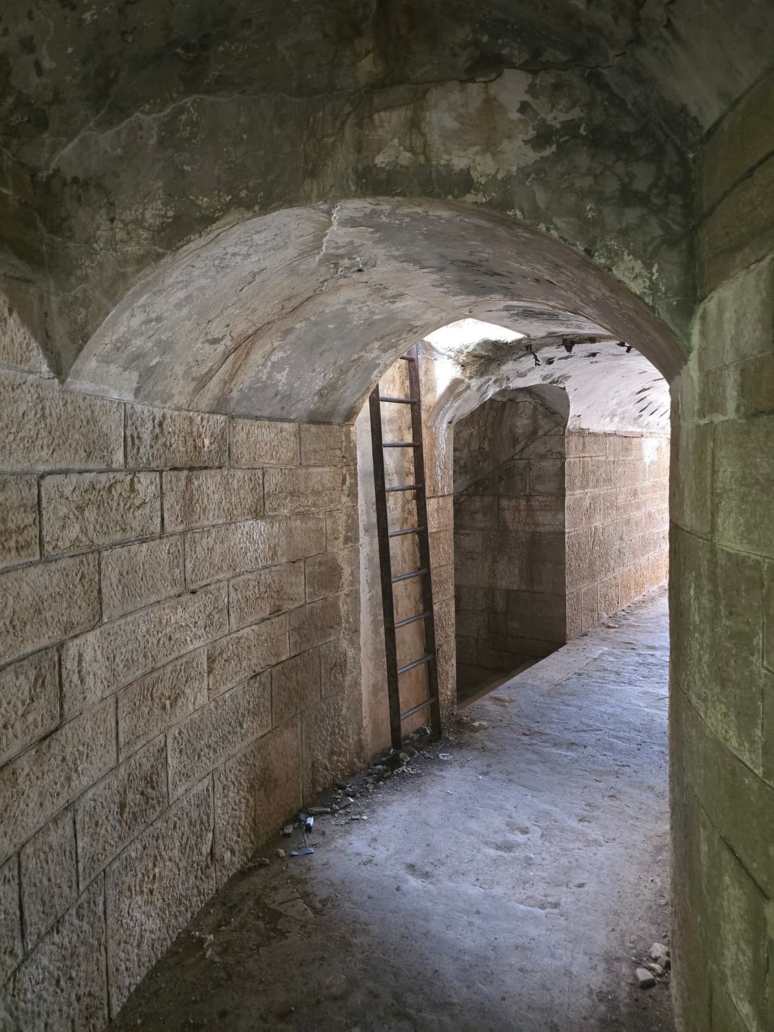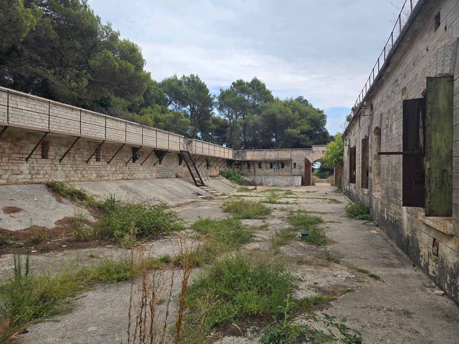 So, somewhere at the beginning of the 20th century the fortifications across Europe were upgraded with concrete roofs. I guess, in case of fort Benedetto, its fire platforms fell victim to the upgrade. The southern gun platform had a gun hangar next to it, and upon giving the upgrade they didn't even bother removing the rails: the rails just went straight under the concrete slab. It's not like people hoped to remove the protective cover one day, bring the guns back and resume like nothing had happened, is it?