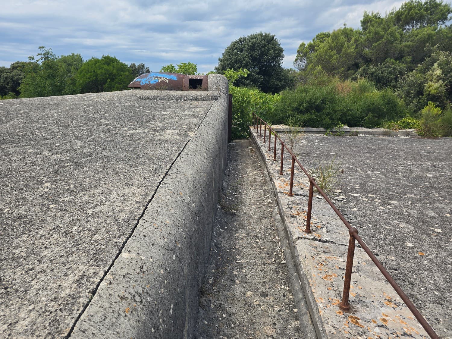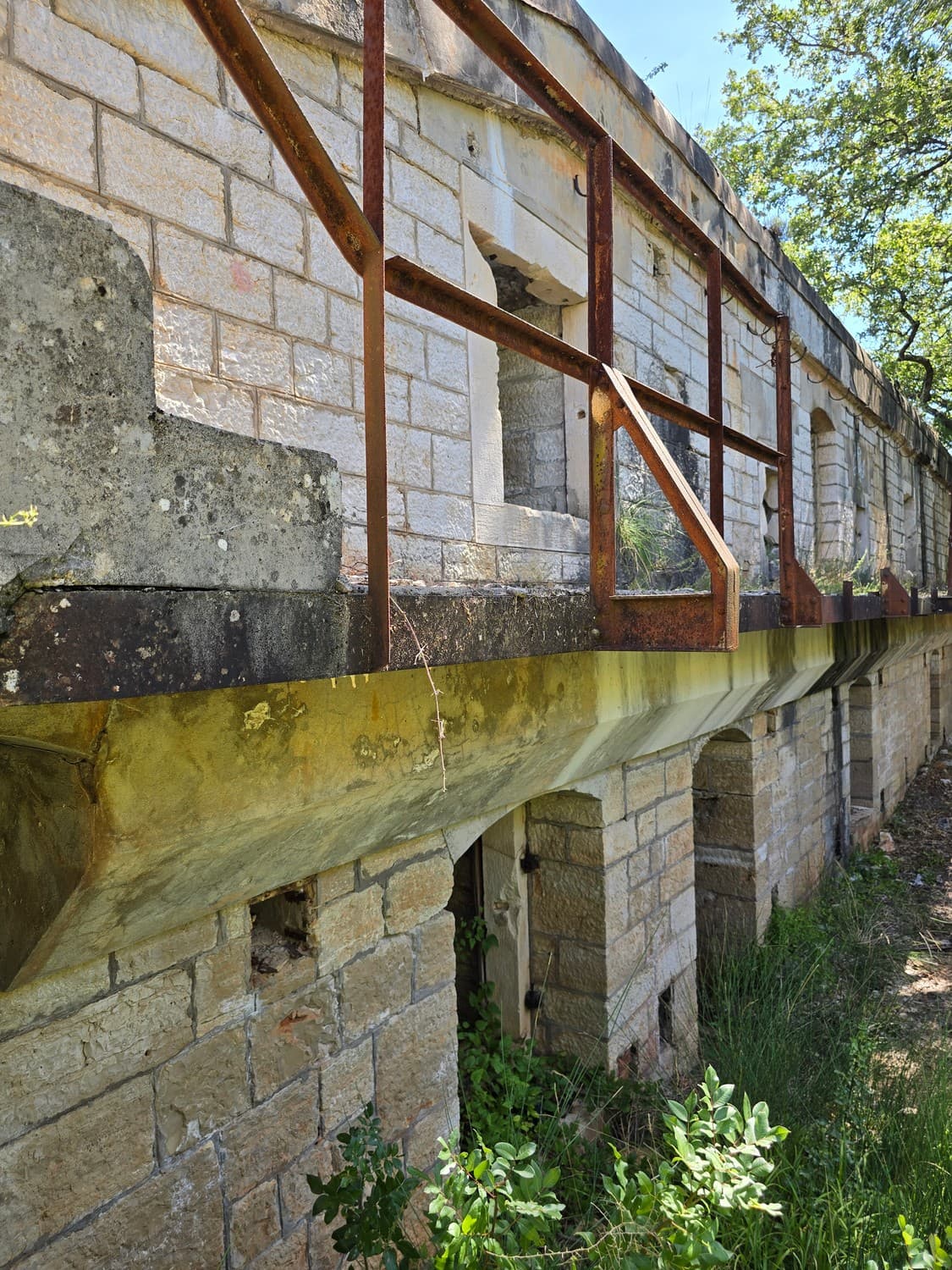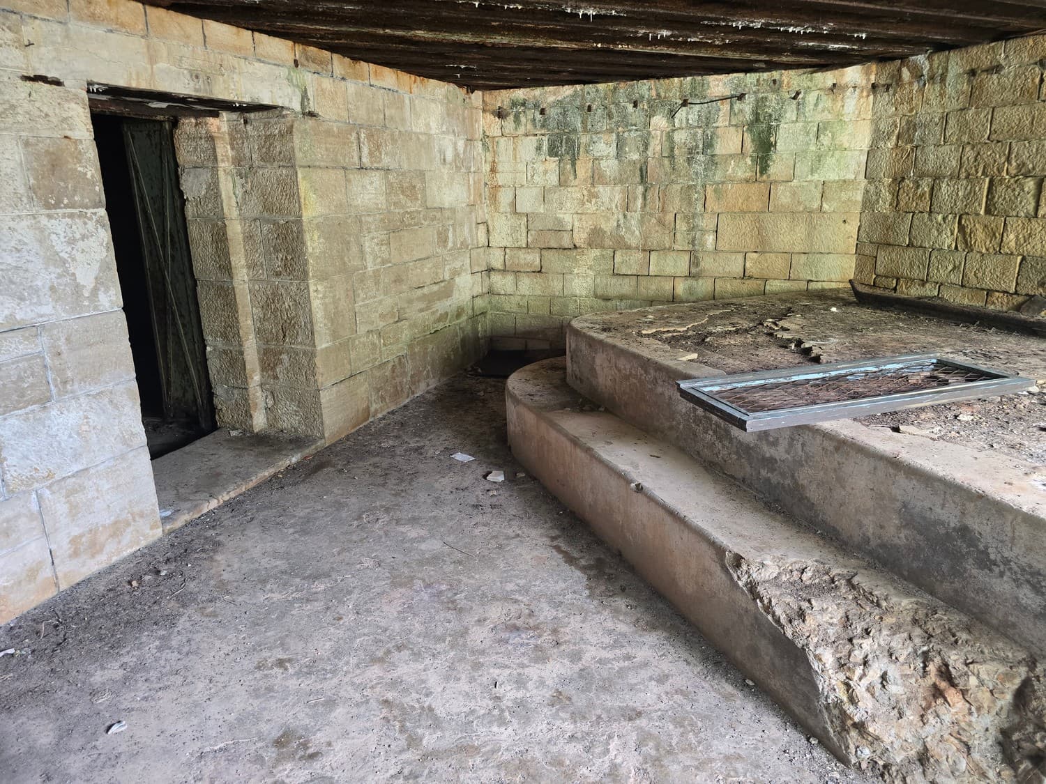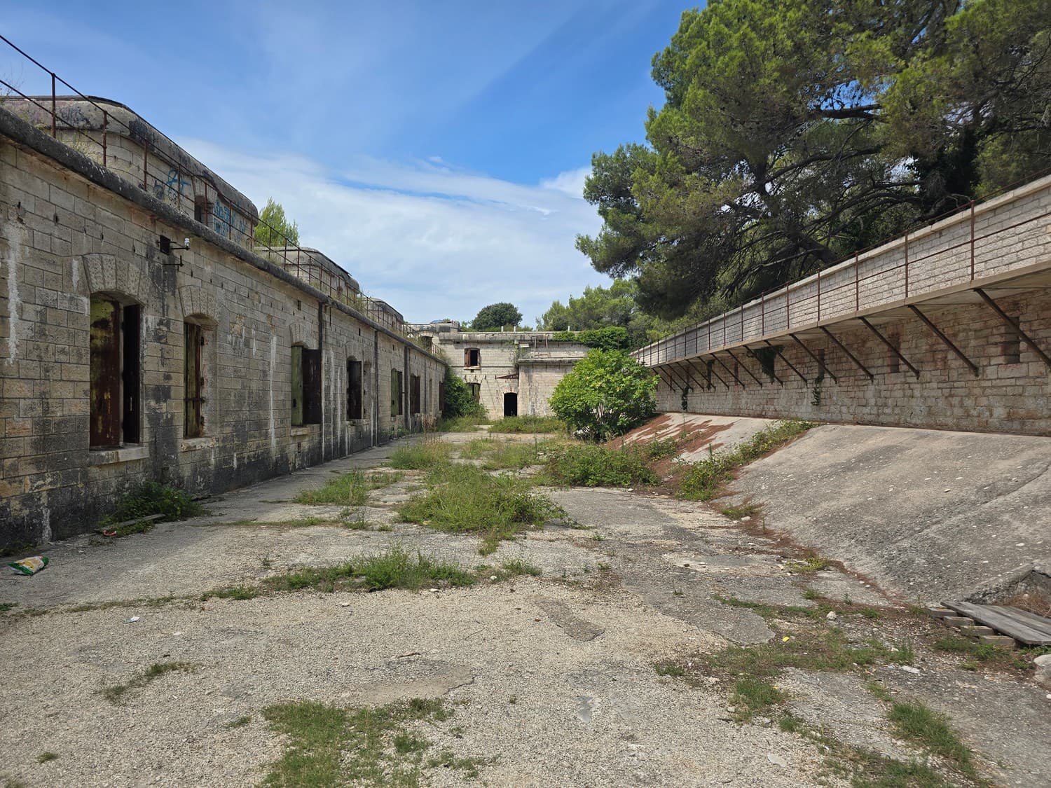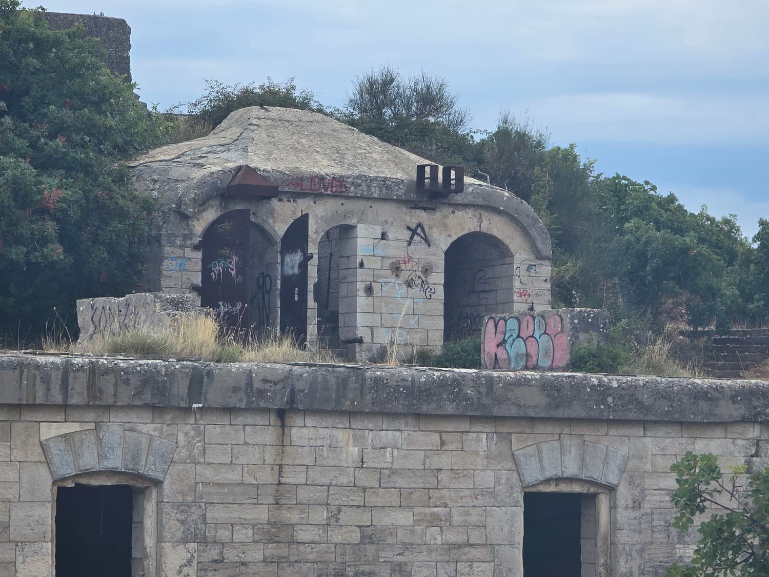 So, somewhere at the beginning of the 20th century the fortifications across Europe were upgraded with concrete roofs. I guess, in case of fort Benedetto, its fire platforms fell victim to the upgrade. The southern gun platform had a gun hangar next to it, and upon giving the upgrade they didn't even bother removing the rails: the rails just went straight under the concrete slab. It's not like people hoped to remove the protective cover one day, bring the guns back and resume like nothing had happened, is it?