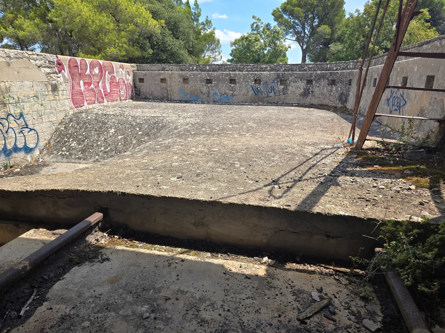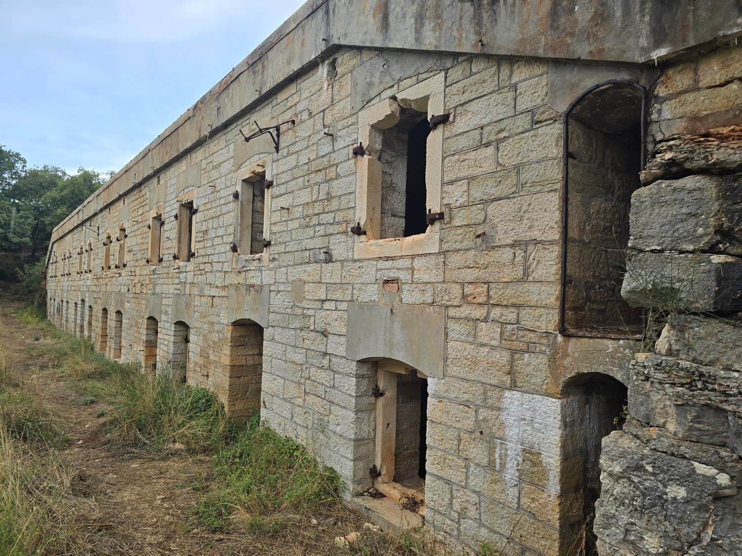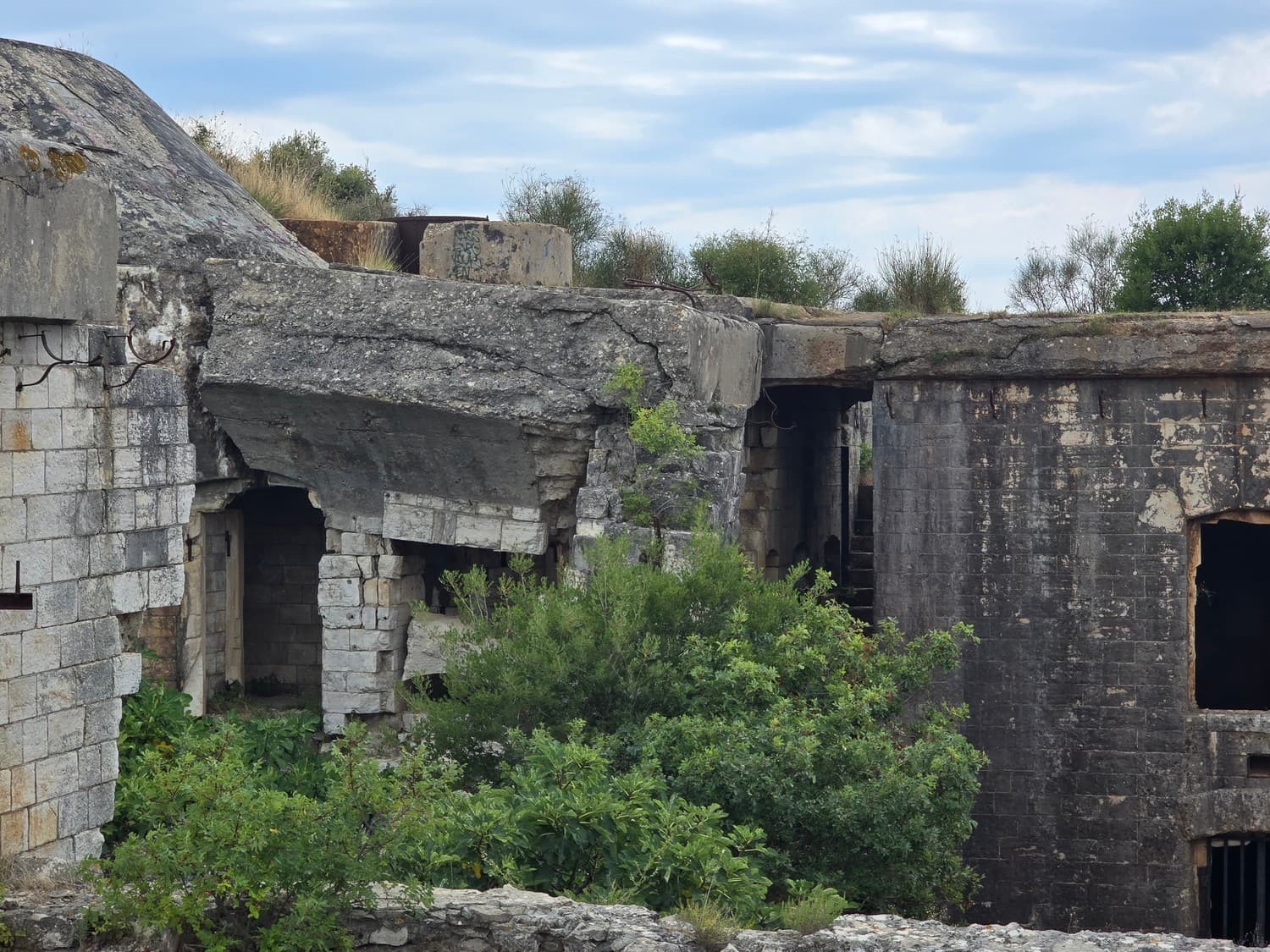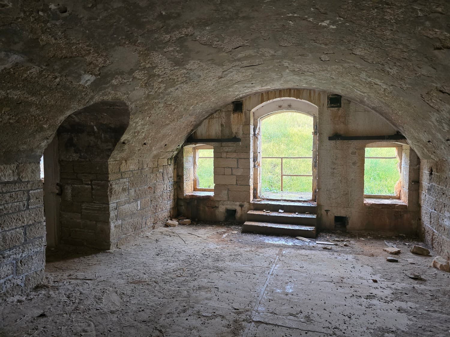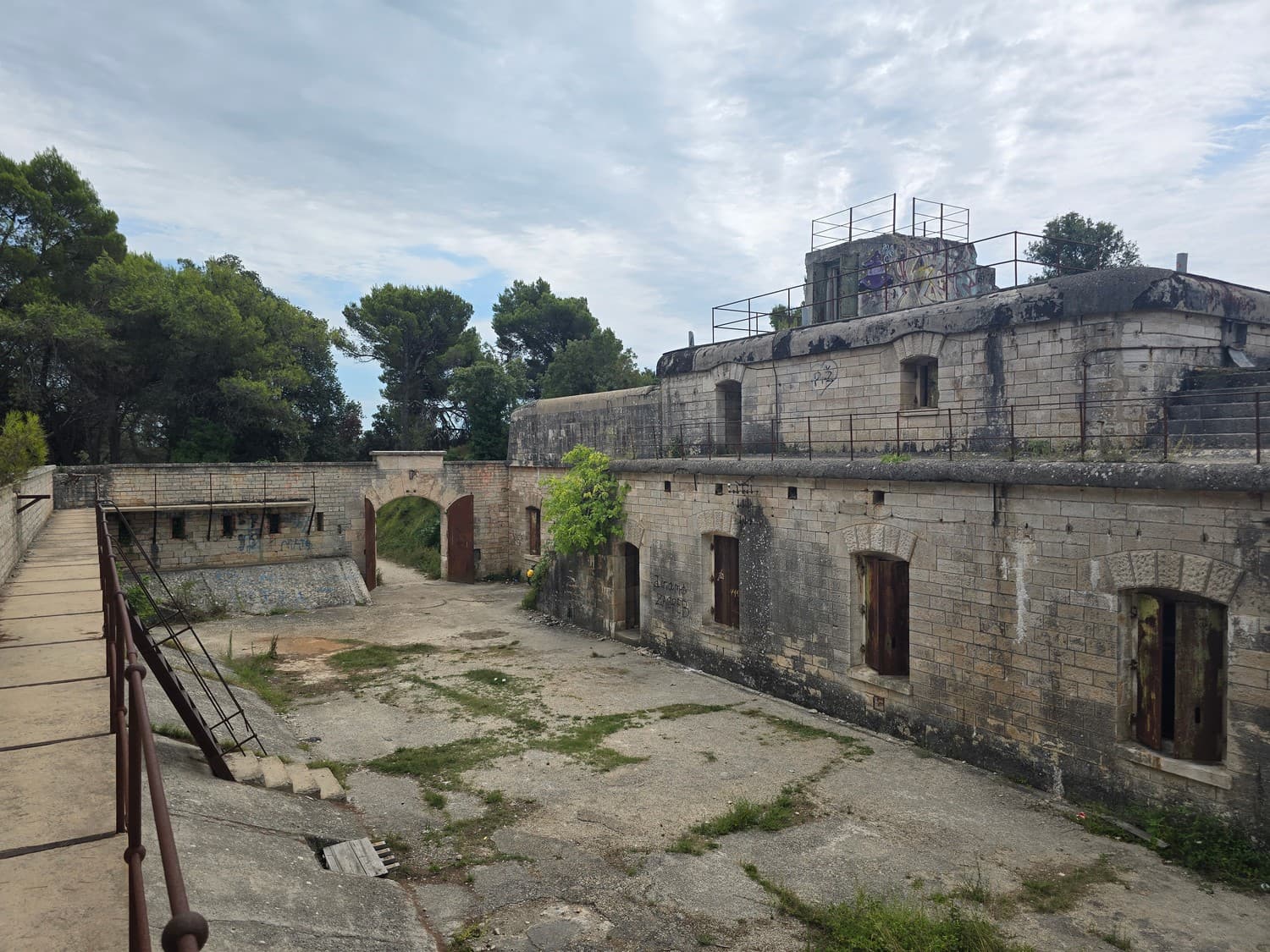 So, somewhere at the beginning of the 20th century the fortifications across Europe were upgraded with concrete roofs. I guess, in case of fort Benedetto, its fire platforms fell victim to the upgrade. The southern gun platform had a gun hangar next to it, and upon giving the upgrade they didn't even bother removing the rails: the rails just went straight under the concrete slab. It's not like people hoped to remove the protective cover one day, bring the guns back and resume like nothing had happened, is it?