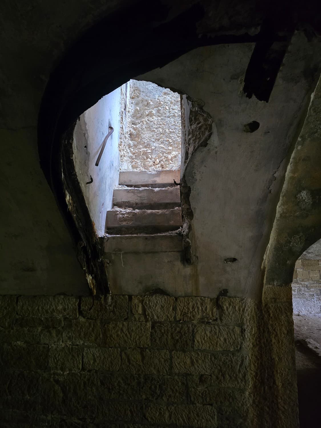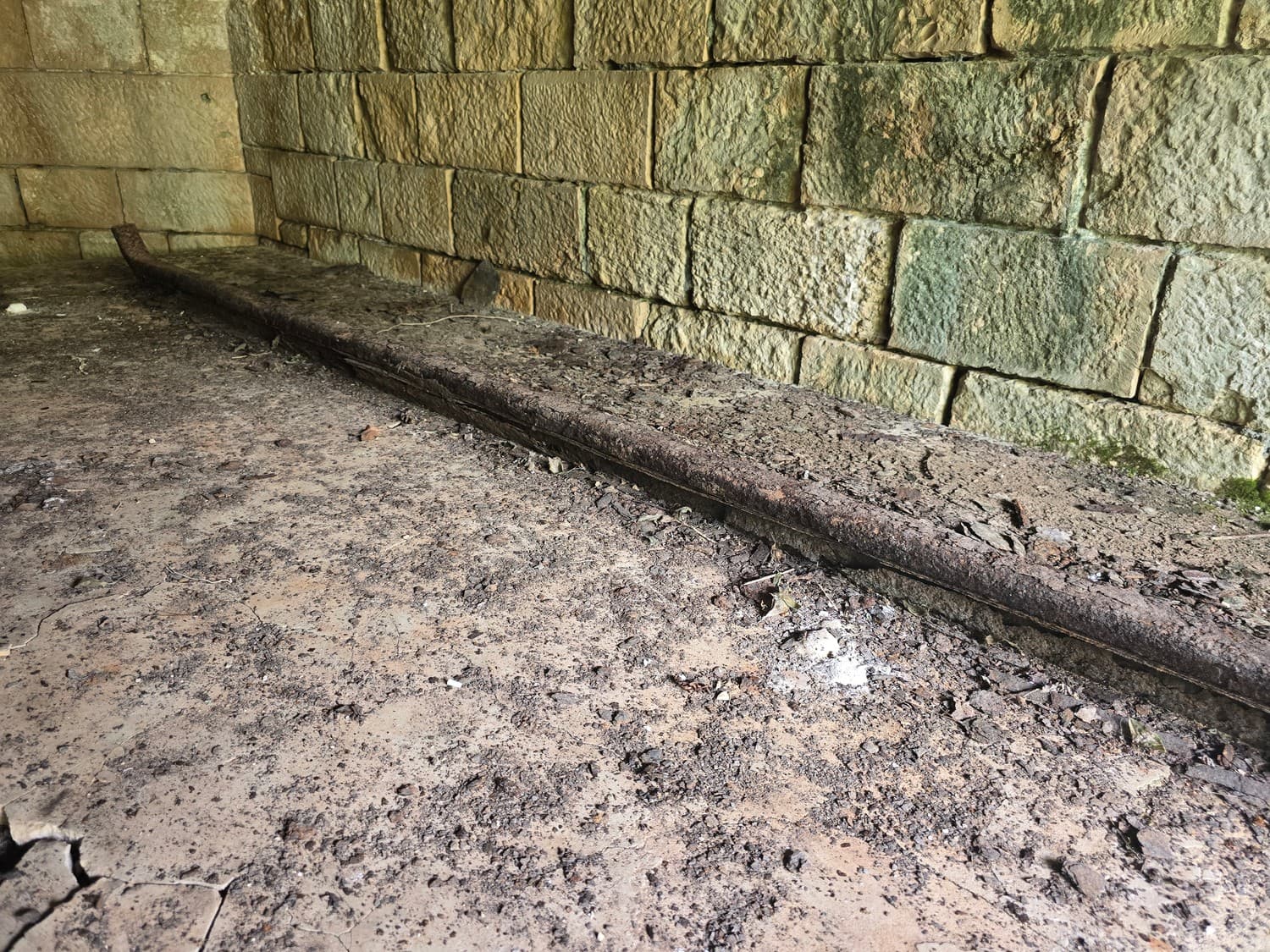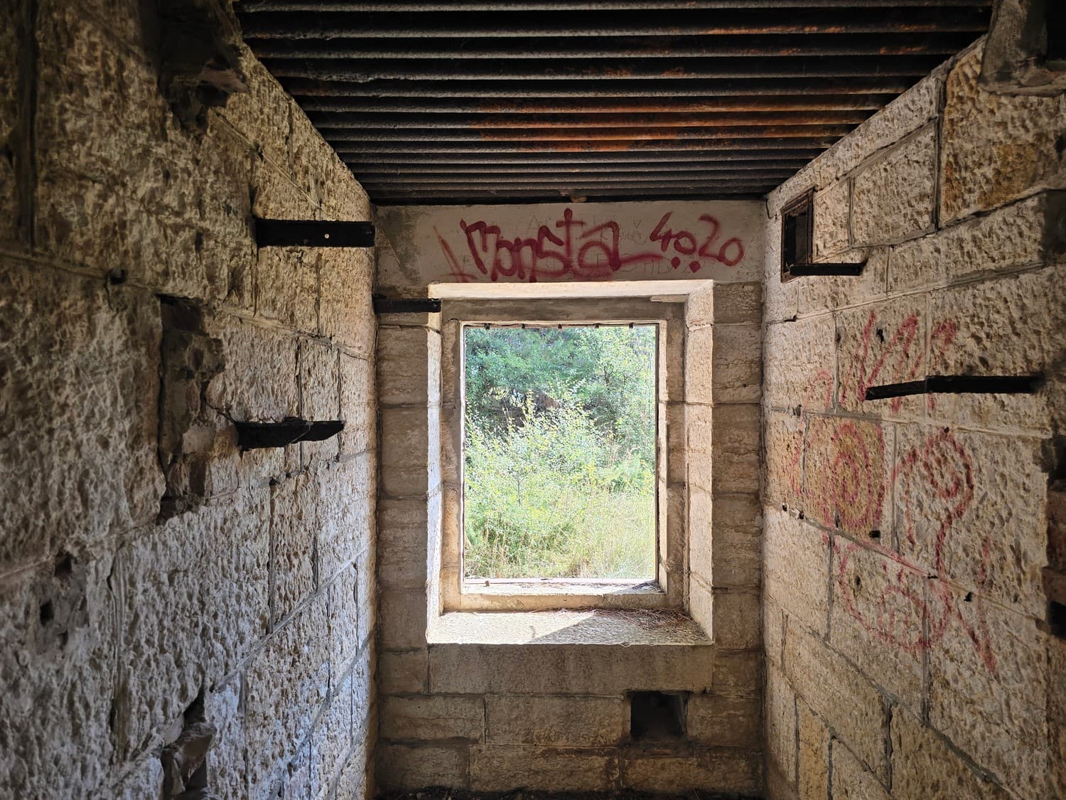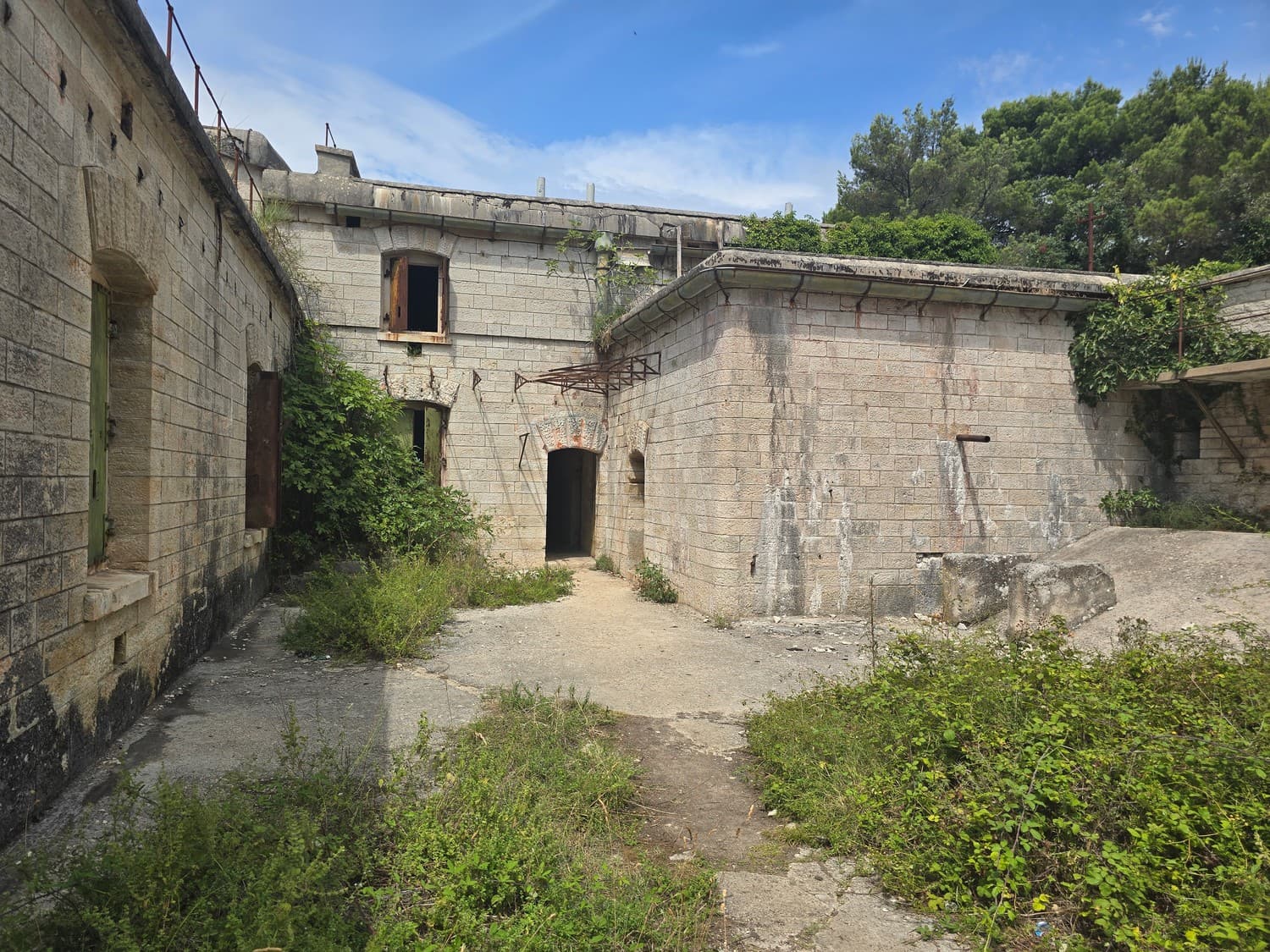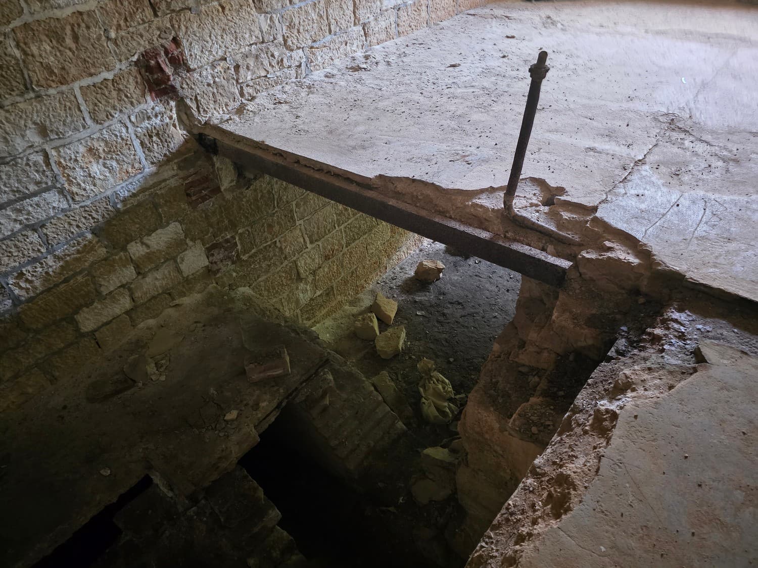 So, somewhere at the beginning of the 20th century the fortifications across Europe were upgraded with concrete roofs. I guess, in case of fort Benedetto, its fire platforms fell victim to the upgrade. The southern gun platform had a gun hangar next to it, and upon giving the upgrade they didn't even bother removing the rails: the rails just went straight under the concrete slab. It's not like people hoped to remove the protective cover one day, bring the guns back and resume like nothing had happened, is it?