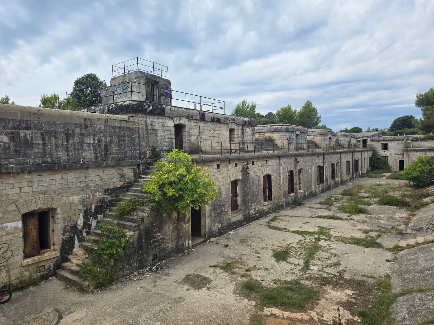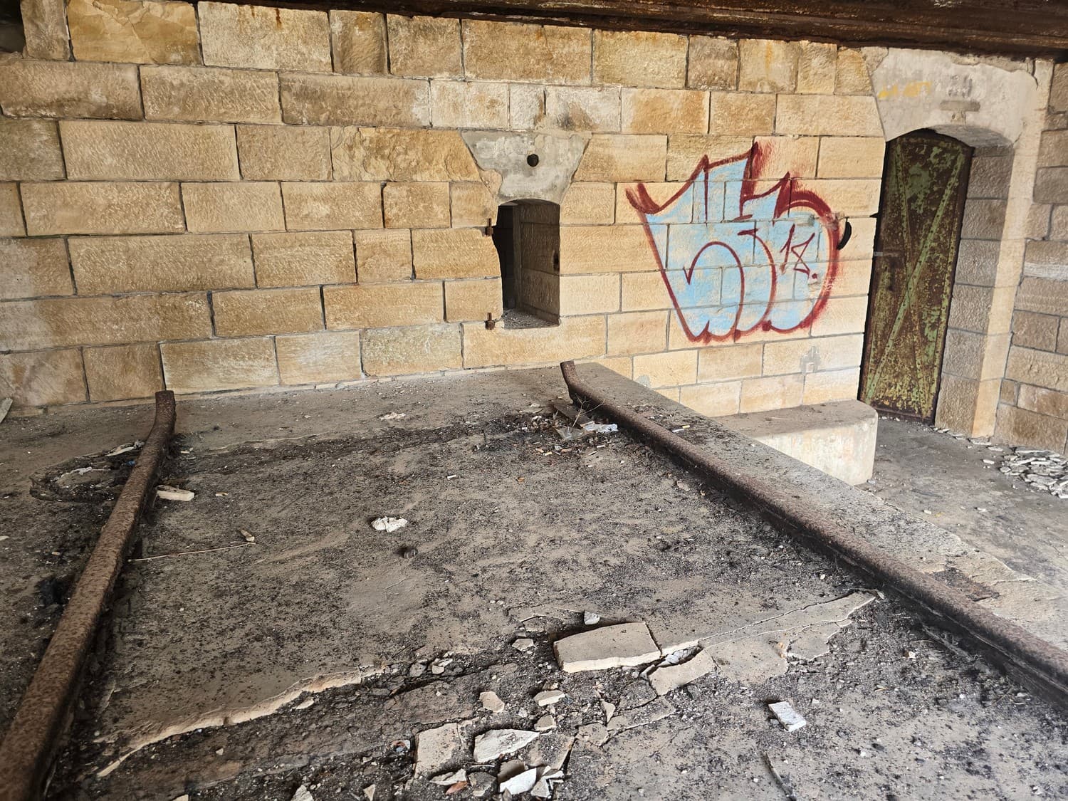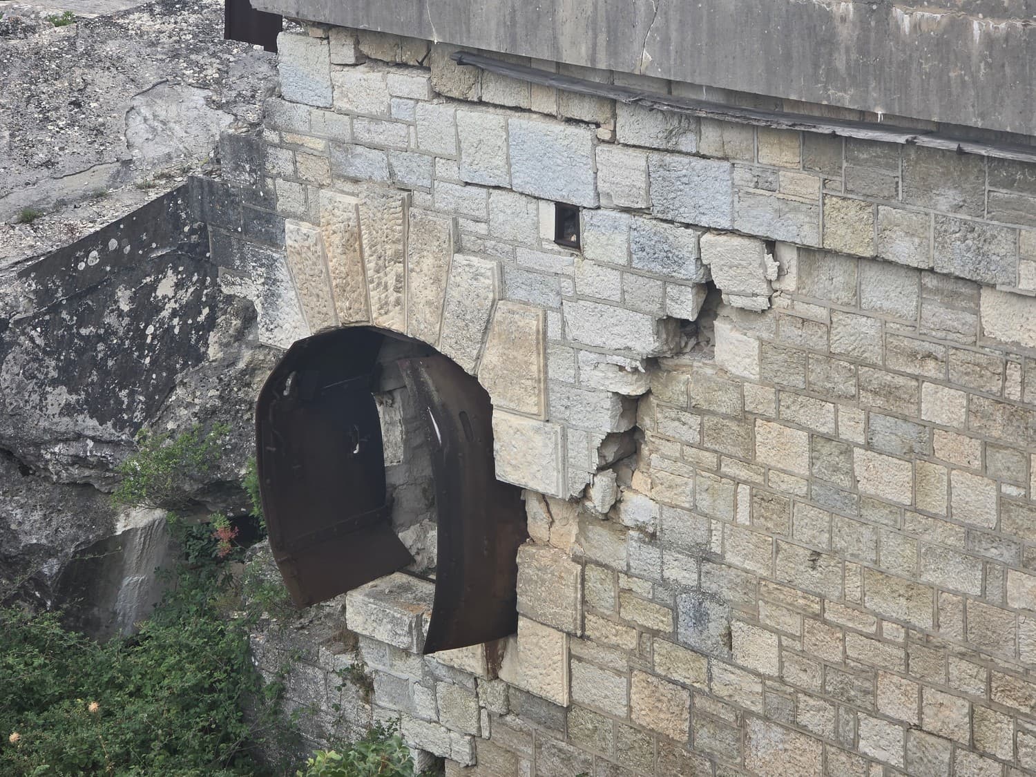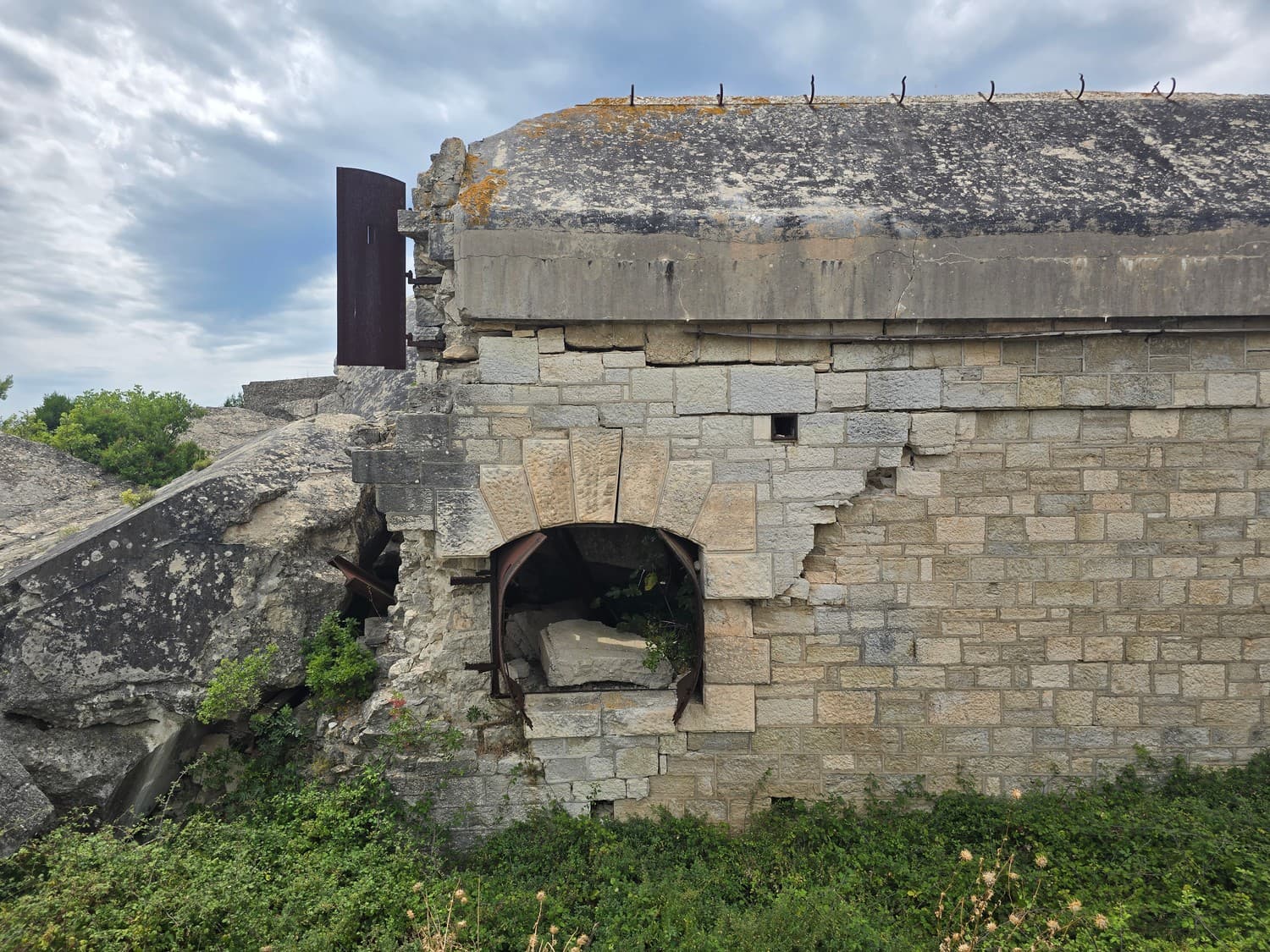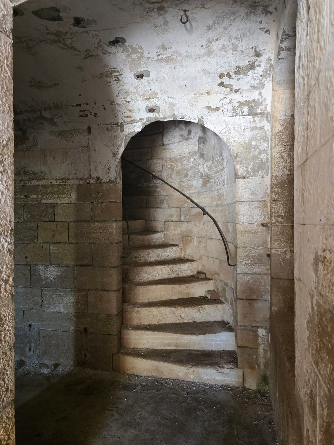 So, somewhere at the beginning of the 20th century the fortifications across Europe were upgraded with concrete roofs. I guess, in case of fort Benedetto, its fire platforms fell victim to the upgrade. The southern gun platform had a gun hangar next to it, and upon giving the upgrade they didn't even bother removing the rails: the rails just went straight under the concrete slab. It's not like people hoped to remove the protective cover one day, bring the guns back and resume like nothing had happened, is it?