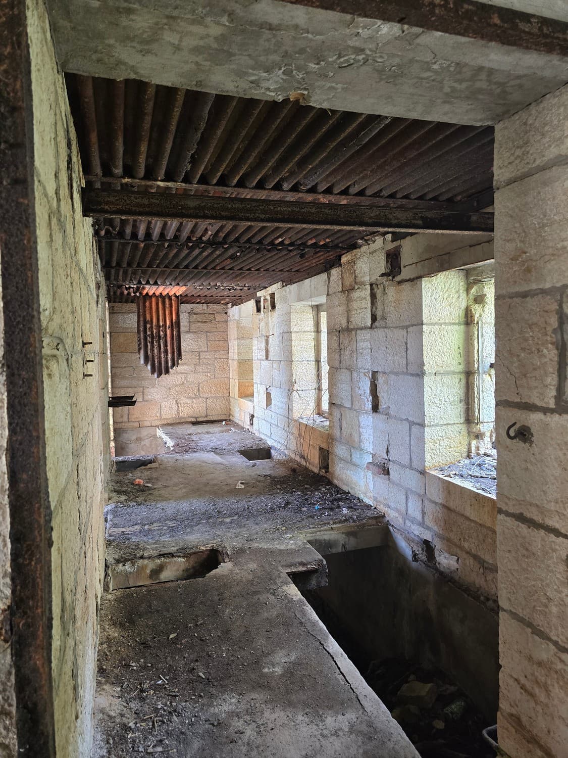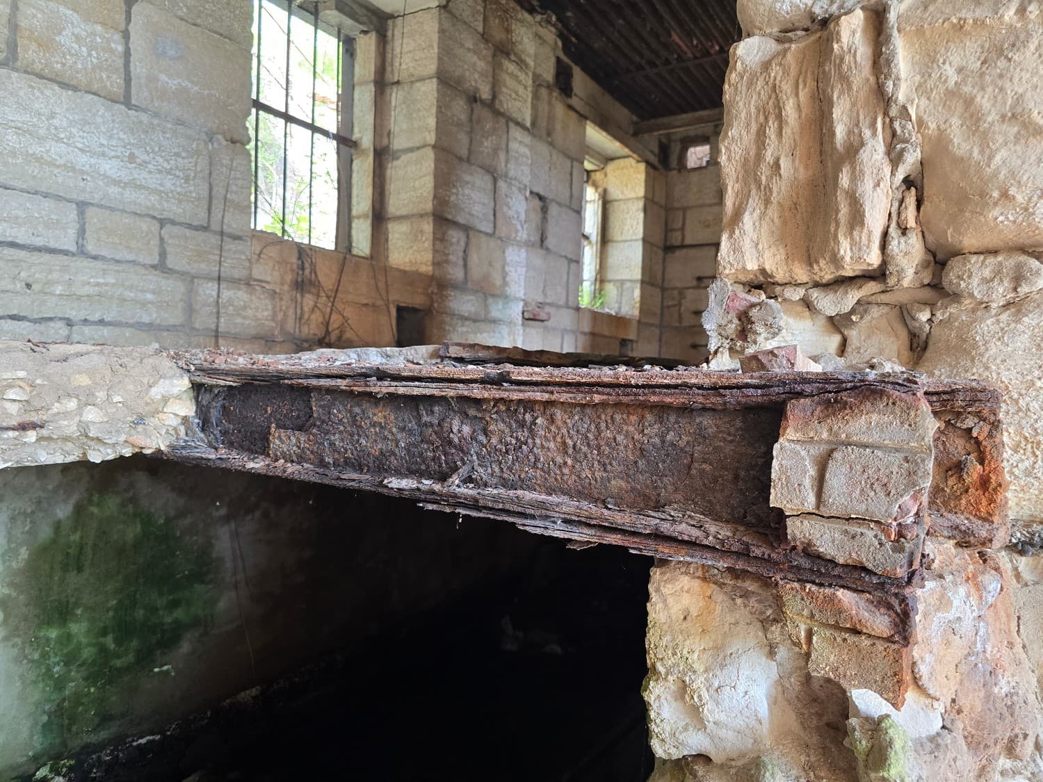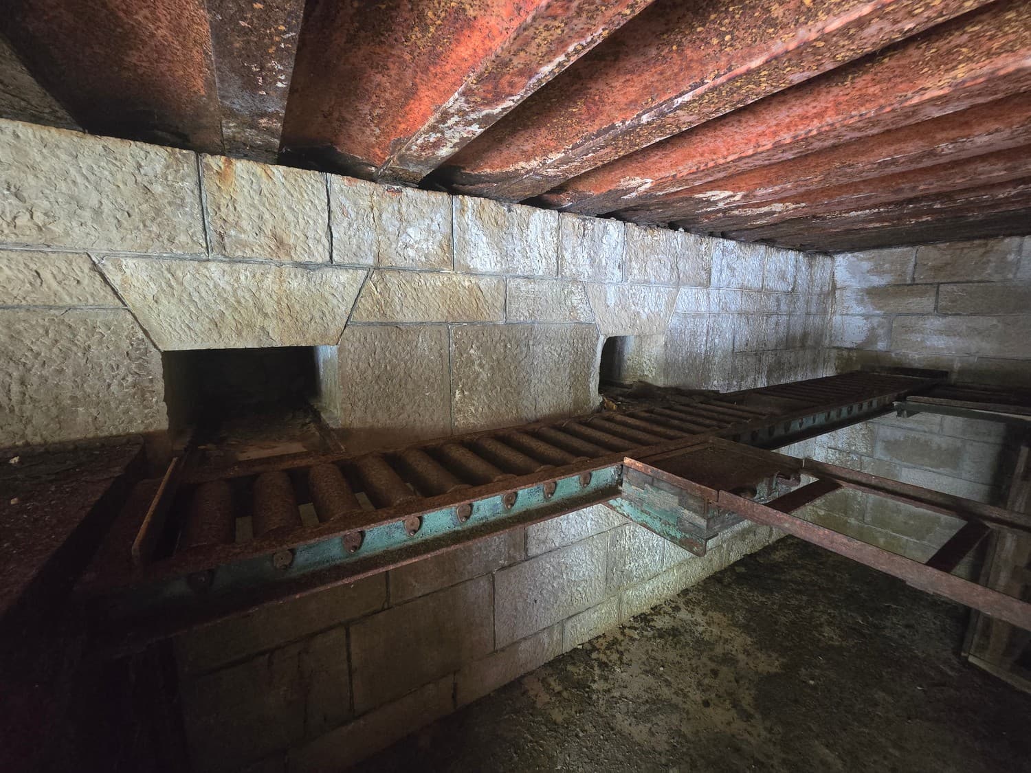 When we reached the second floor, we've found a room where the shaft surfaced. There was the second part of the machine: a set of guide rails with rollers, that started from the elevator and ended next to the small windows. Outside the structure the windows were sealed off and partially covered with concrete, I'll later tell why.