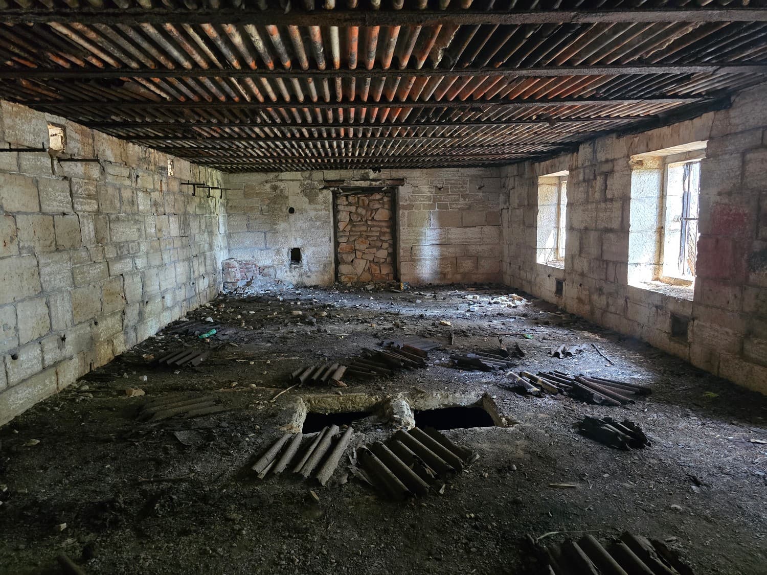 The interior was, as expected, in a rather bad shape. No doors, parts of the roof were laying on the floor. It wasn't safe to walk there, and the building apparently had a basement, but it was filled with water.
