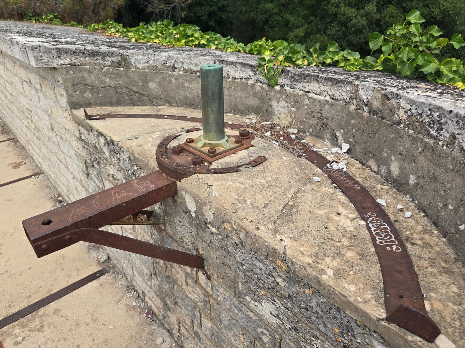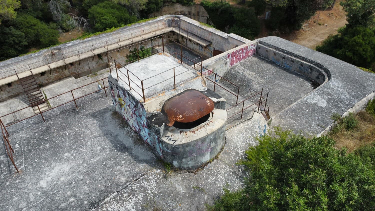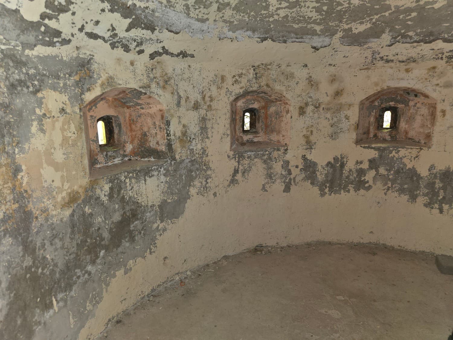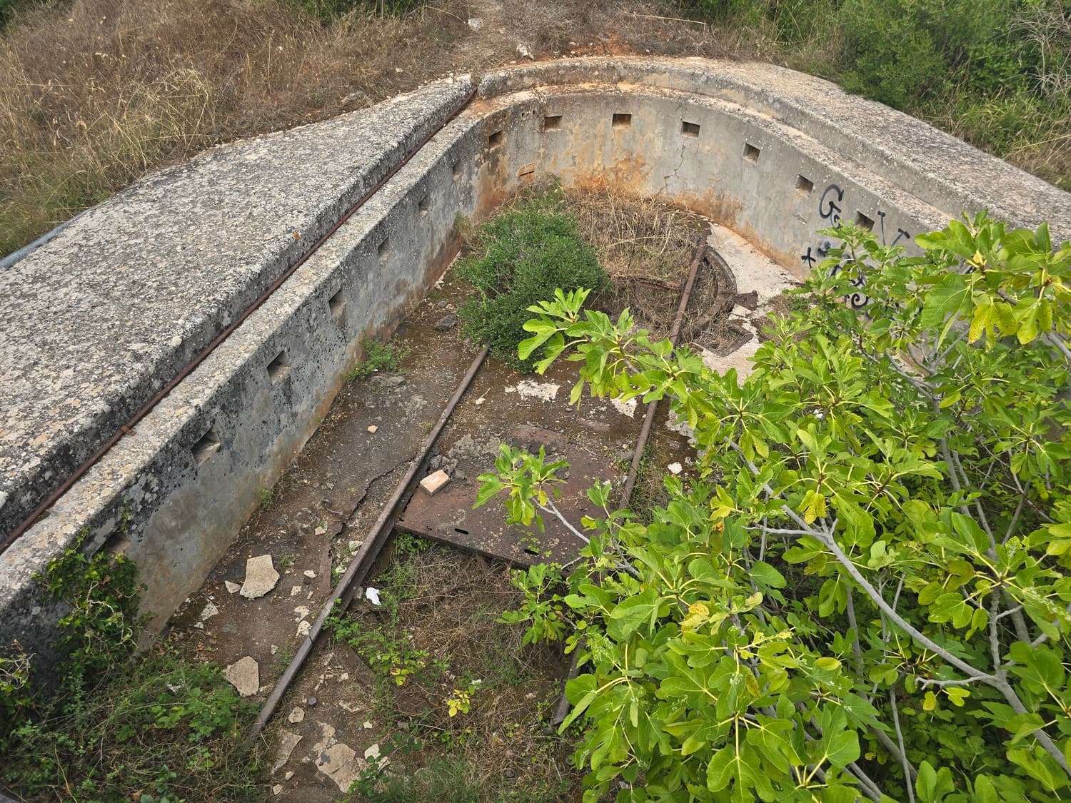 The wall covering the fort from the land side had three (or so) fire dots meant for the miniguns. What's intriguing was the way the mountings were constructed: they had two radial rails of different diameters. I had two theories regarding that: either the second radial rail was a later upgrade, or two different guns could be mounted on the same platform. Since the concrete didn't have any patches or markings, I think the second statement is closer to the truth.