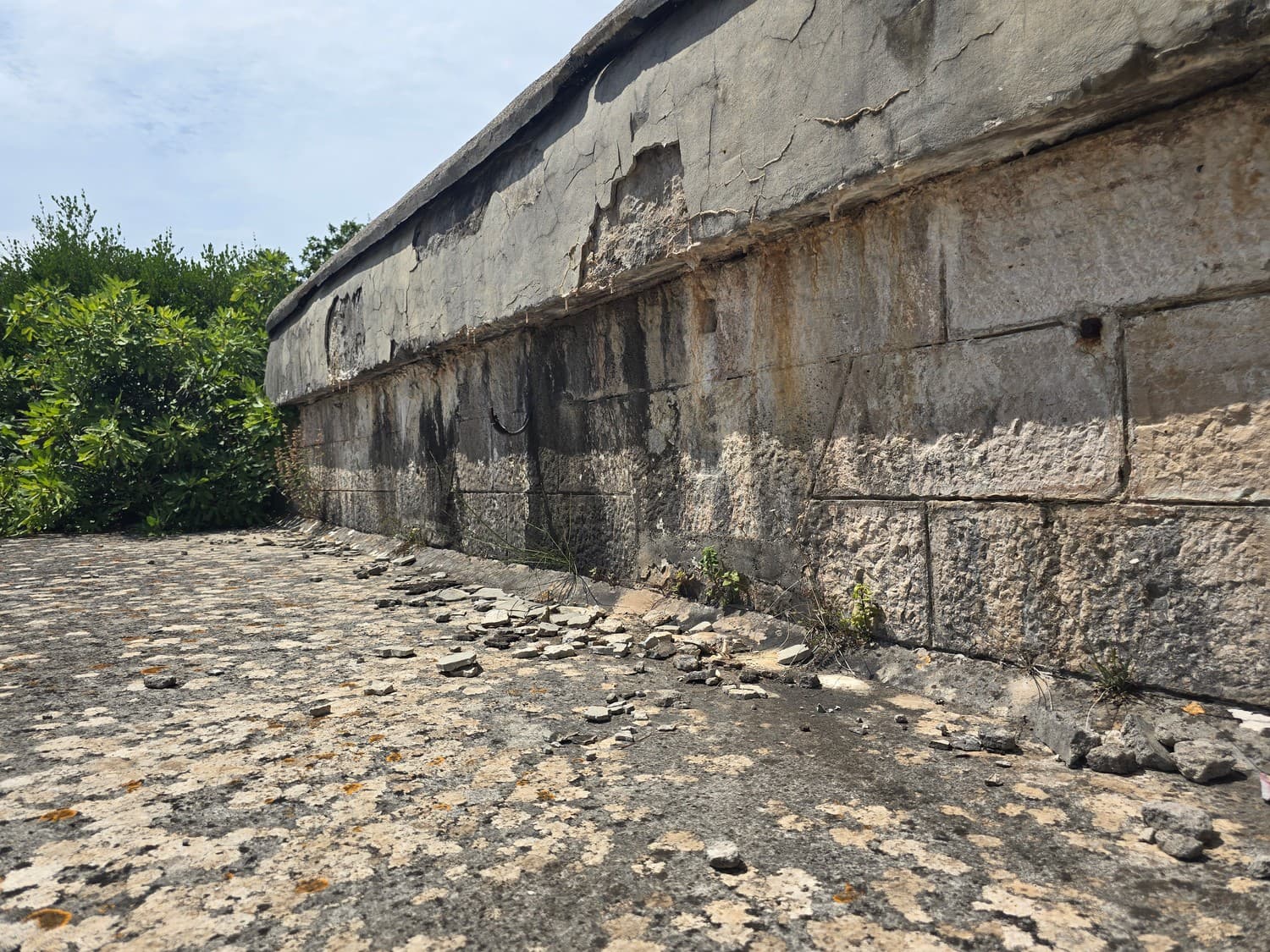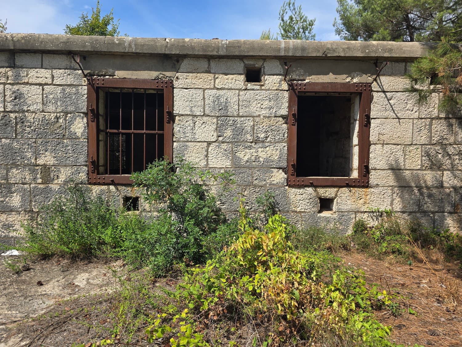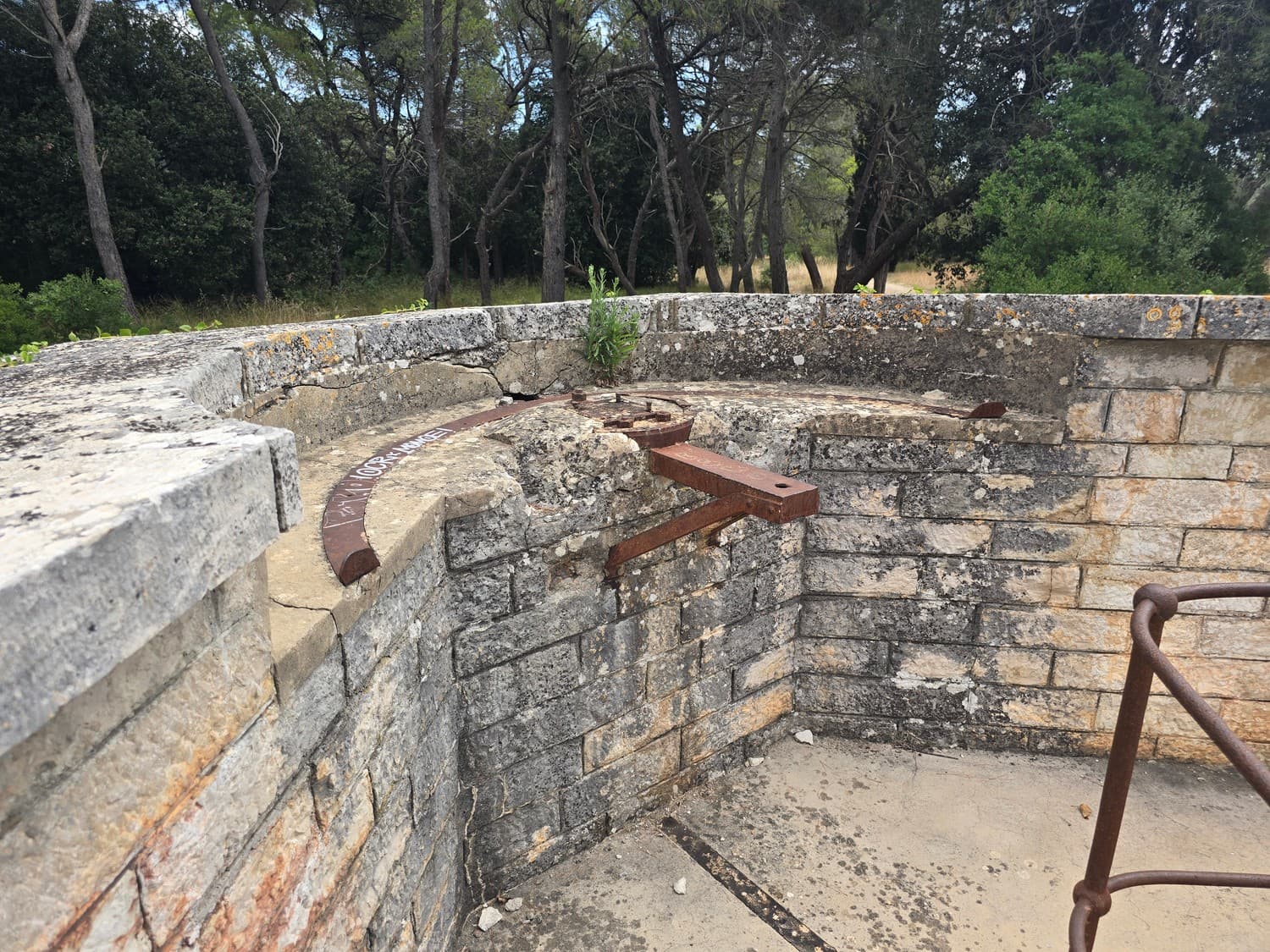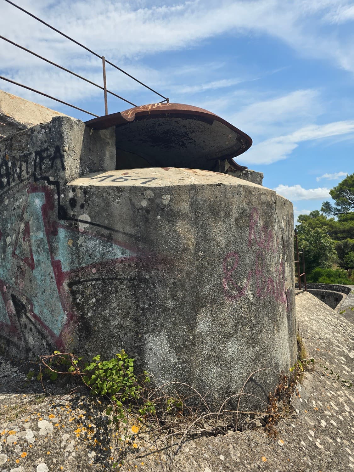 The wall covering the fort from the land side had three (or so) fire dots meant for the miniguns. What's intriguing was the way the mountings were constructed: they had two radial rails of different diameters. I had two theories regarding that: either the second radial rail was a later upgrade, or two different guns could be mounted on the same platform. Since the concrete didn't have any patches or markings, I think the second statement is closer to the truth.