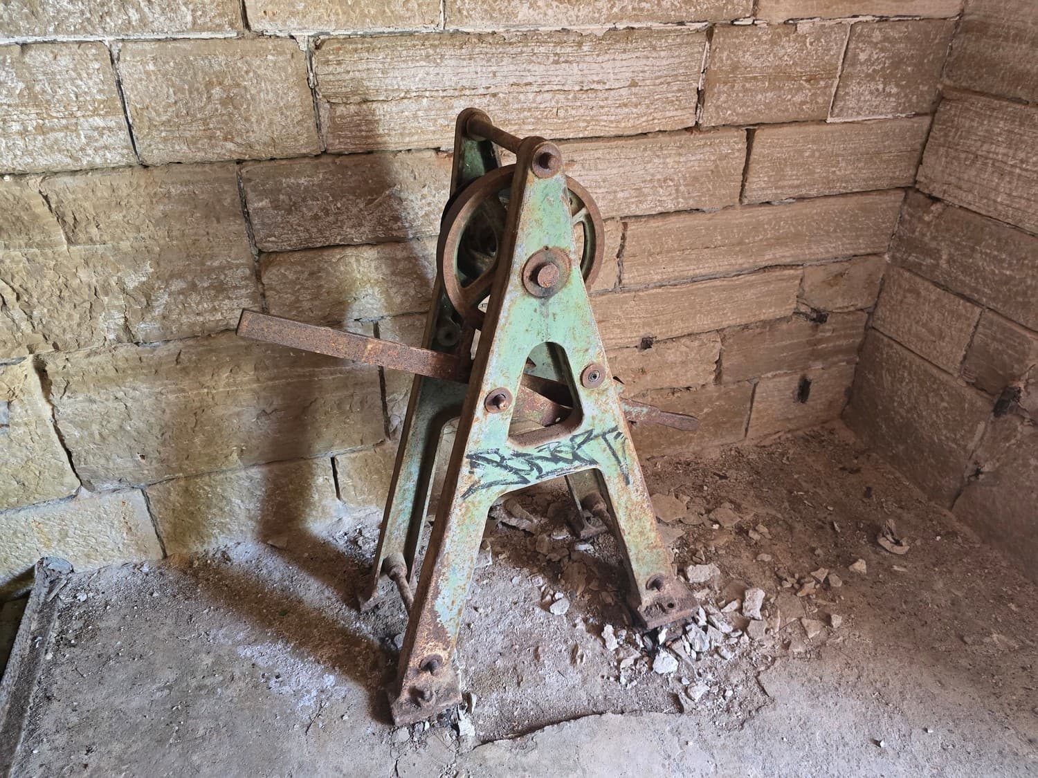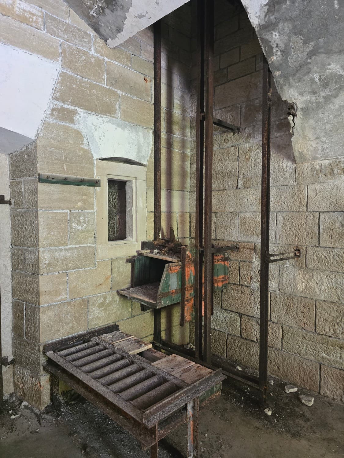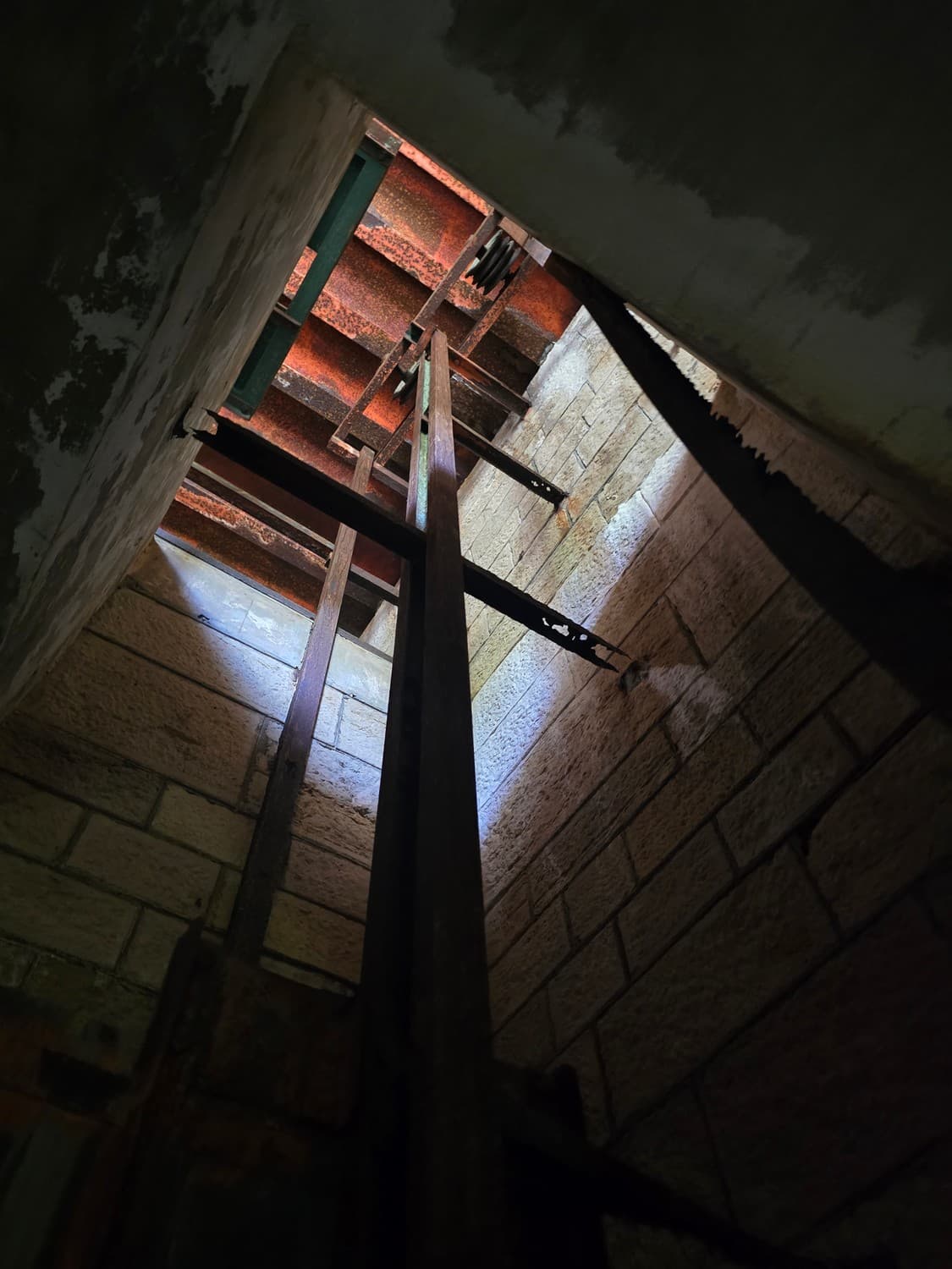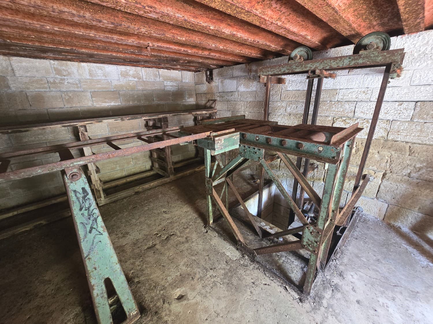 Inside the room there were metal hooks in place that perhaps once held shelves with ammunition. But also, there was a rusty elevator and a shaft that lead to another room upstairs. The equipment was all rusted to the bone, and when my son touched it out of curiosity, it was all covered with a weird mix of rust and machine oil.