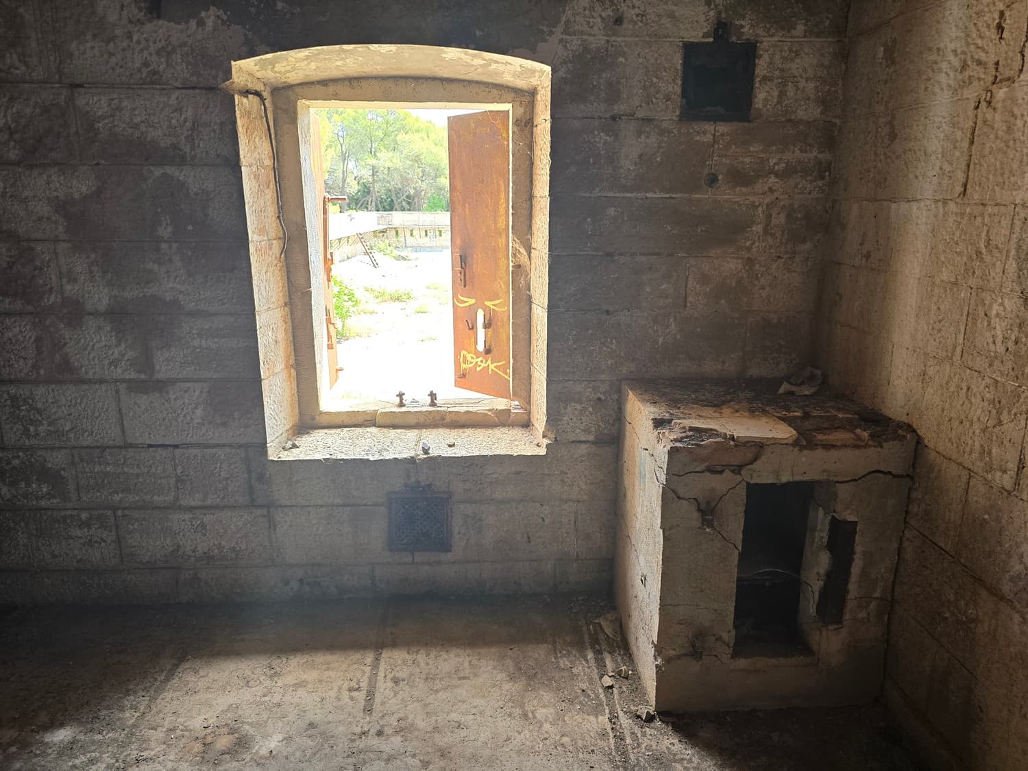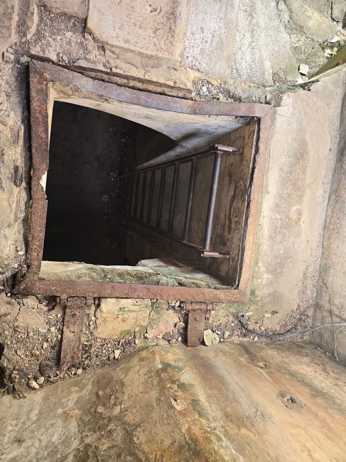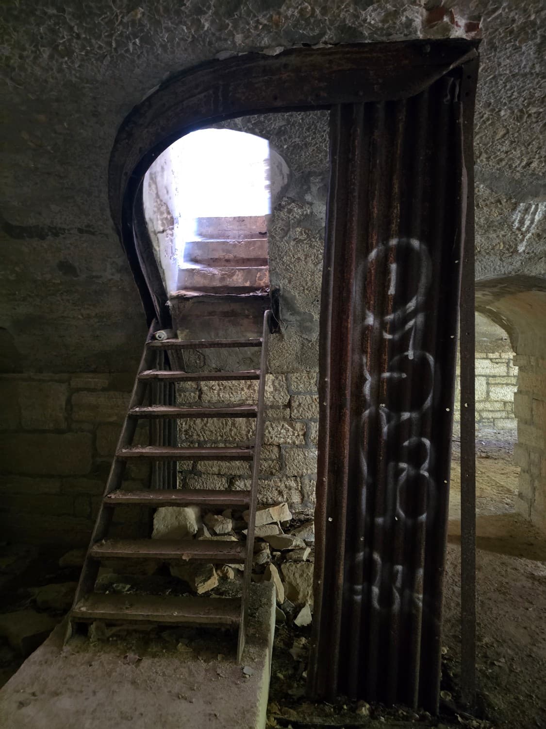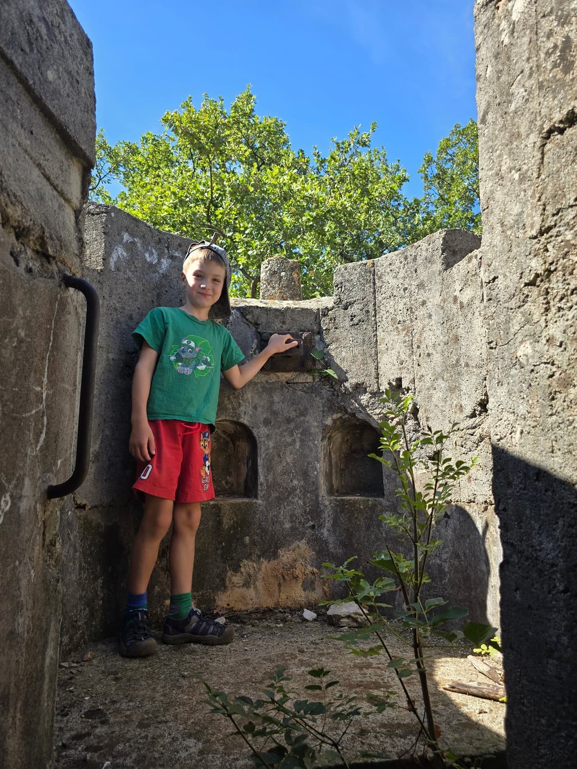 Inside the room there were metal hooks in place that perhaps once held shelves with ammunition. But also, there was a rusty elevator and a shaft that lead to another room upstairs. The equipment was all rusted to the bone, and when my son touched it out of curiosity, it was all covered with a weird mix of rust and machine oil.