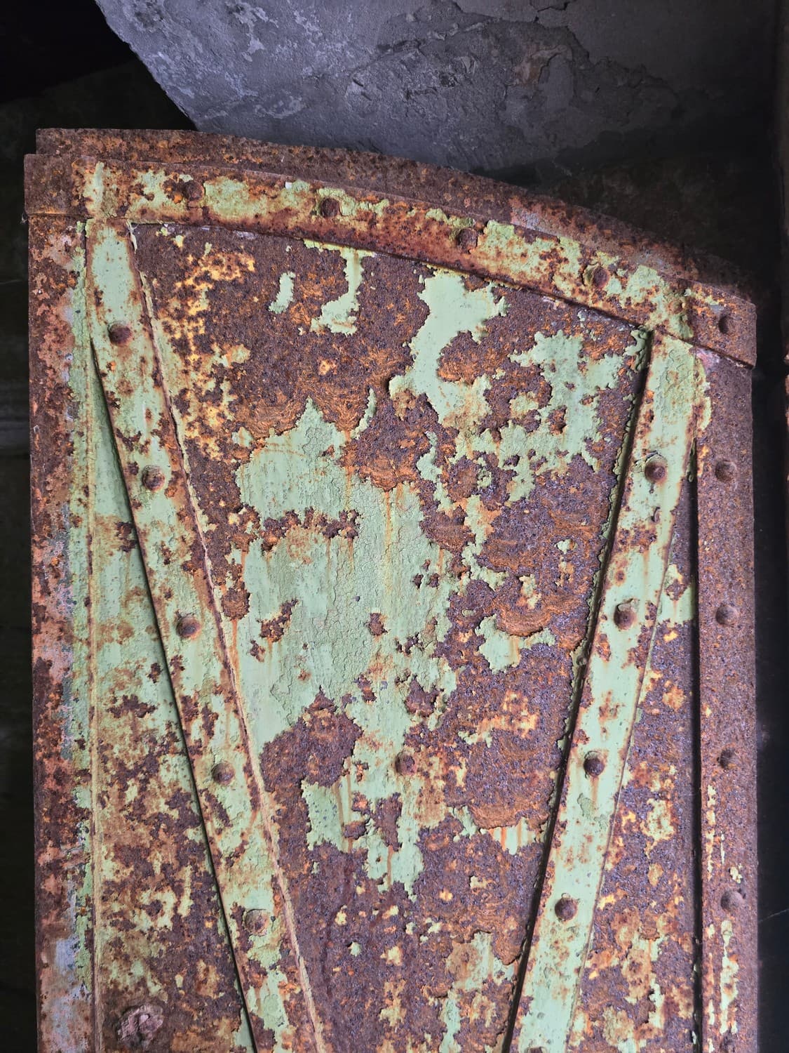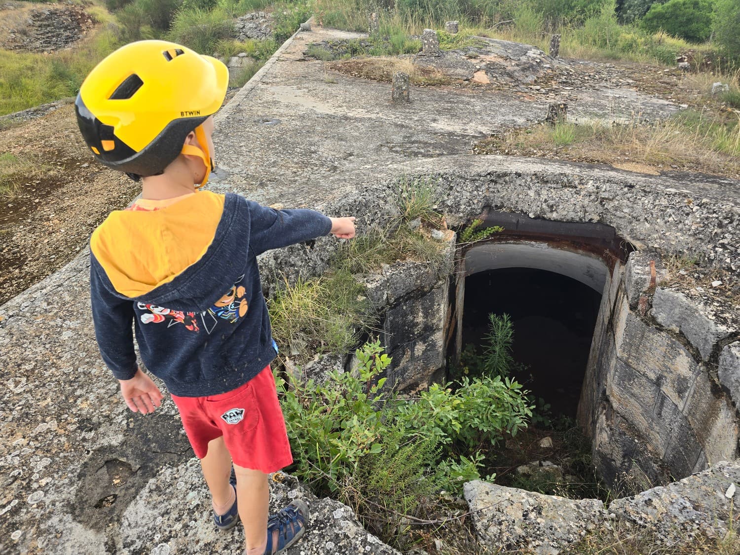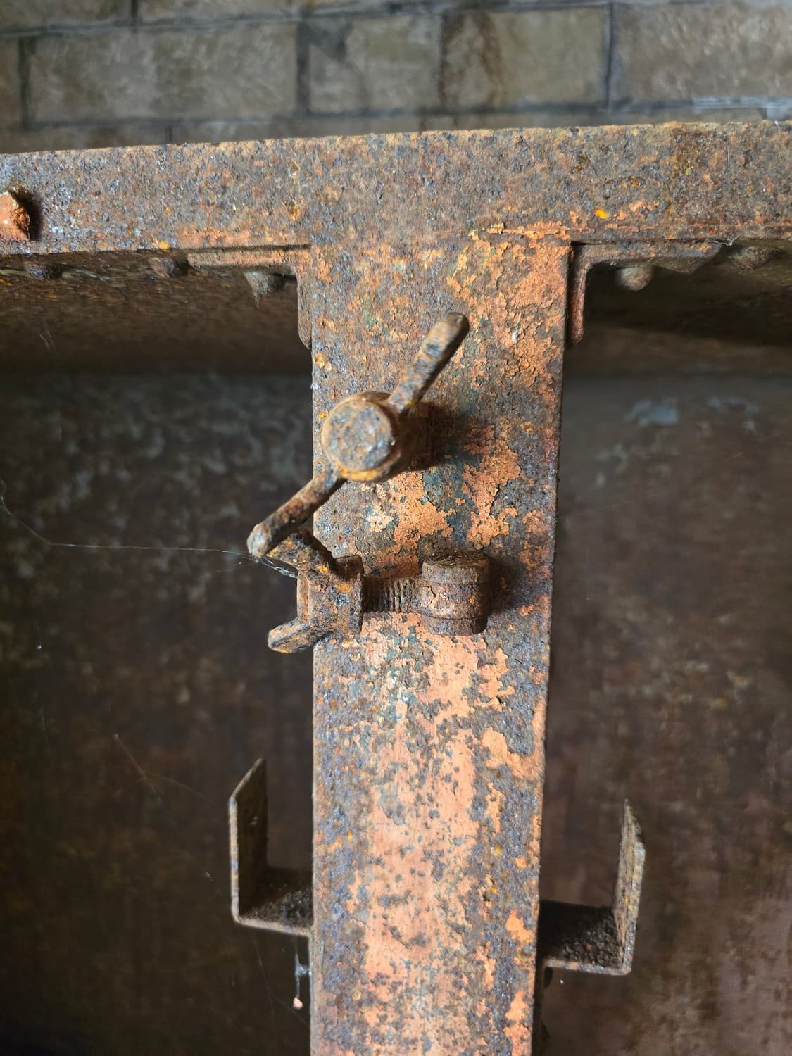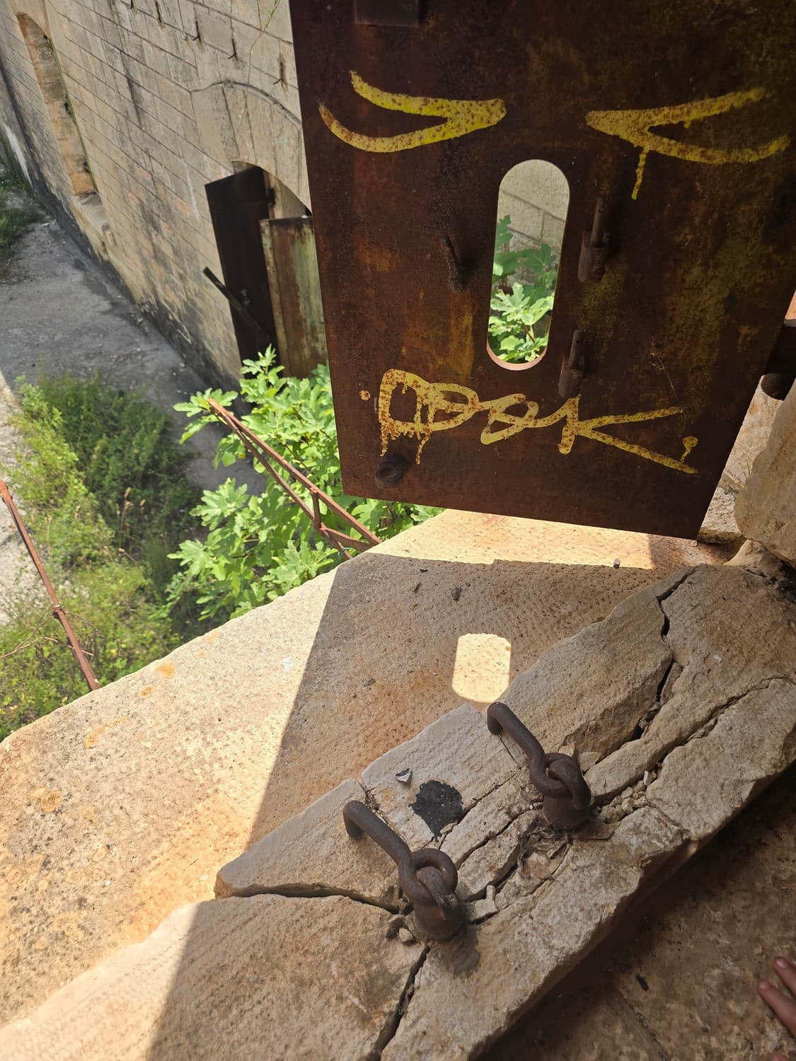 Inside the room there were metal hooks in place that perhaps once held shelves with ammunition. But also, there was a rusty elevator and a shaft that lead to another room upstairs. The equipment was all rusted to the bone, and when my son touched it out of curiosity, it was all covered with a weird mix of rust and machine oil.