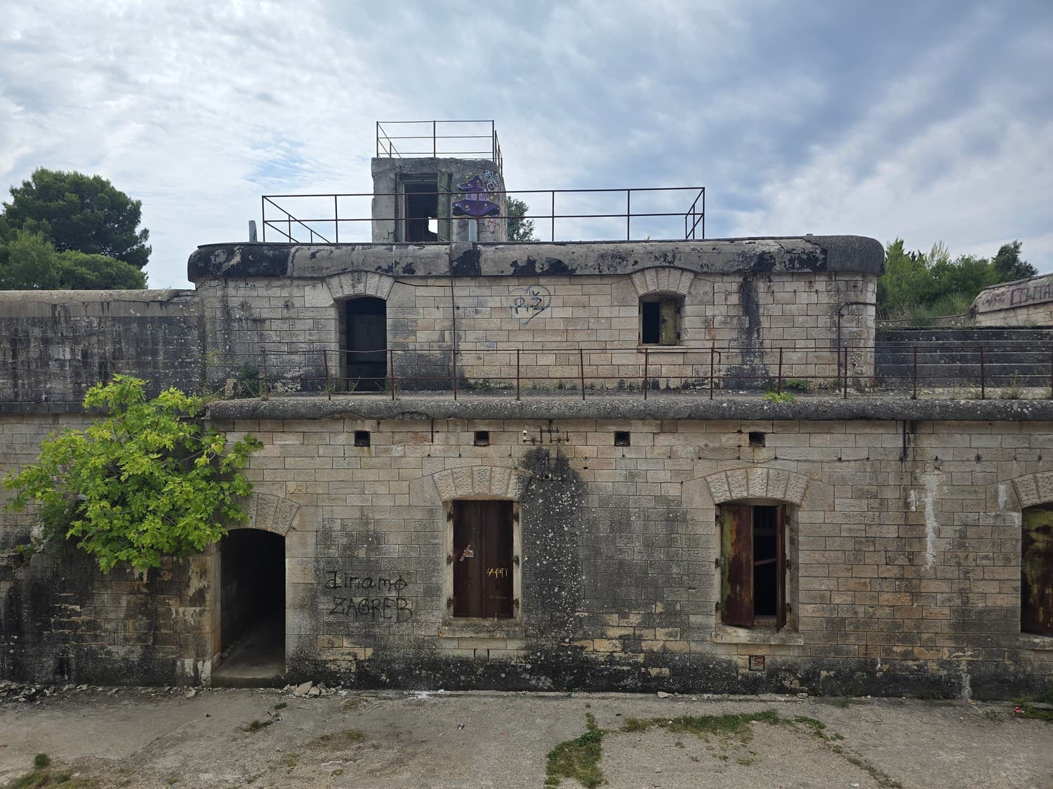 When we reached the roof, we've found... nothing. Originally, the fort had four gun platforms equipped with 150mm L/40 coastal defense guns, plus two flanking platforms with smaller 70mm L/42 guns. Today, (almost) all platforms, as well as every horizontal surface of the roof were covered with concrete slabs.