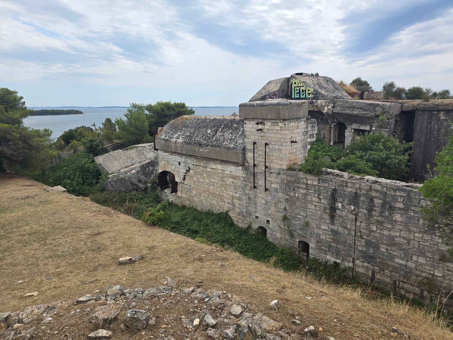 The fort was built in year 1914, cut from the solid rock, perfectly blending with the surrounding landscape. It's armament, however, was quite modest: two 350mm L/35 and two 280mm L/35 guns. The fort was capable of making crossfire with the other fort Brioni Minor (located on the island) in order to defent the Fazana channel.