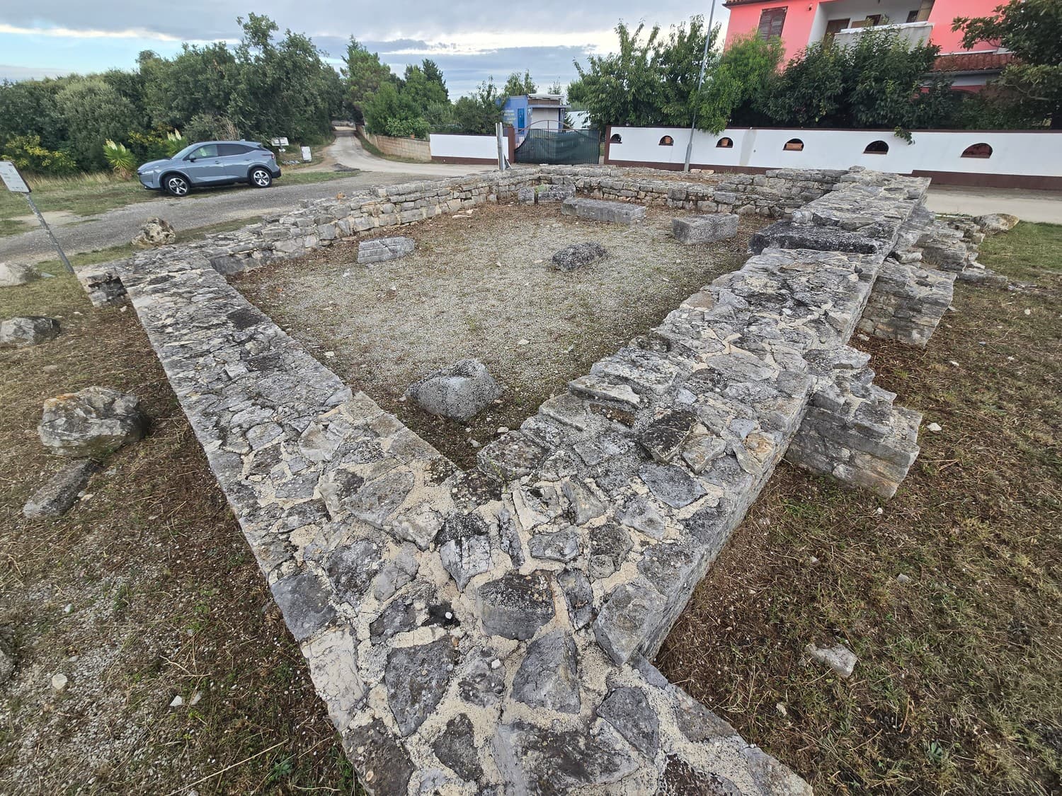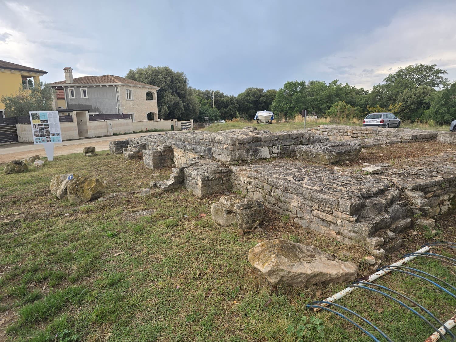 Turned out it was a early christian chapel discovered in 2005 and built somewhere in the 5th century on the place of a ancient (probably roman) mausoleum. The info board said the remnants of a cornice and column capitals were found on site, as well as stone coffins with the remains of dead people inside. The church had two sections: the main one and the ossuary, and today partially hidden below the road.